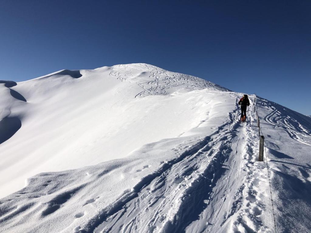 Am Grat und in der Sonne bewältigen wir noch die letzten Meter zum Wintergipfel. Der eigentliche Gipfel ist mit einer Abfahrt verbunden, daher hat sich ein sogenannter Wintergipfel für die Skitouristen etabliert.