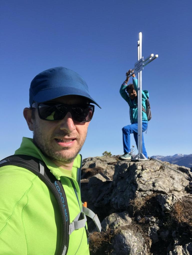 Dennoch stehen wir abwechseln auf dem Gipfel, damit wir schöne Fotos machen können. Platz zum Brotzeiten ist auf dem Gipfel eh nicht, feiner ist das am leichteren Gipfel in einer windgeschützten Kuhle.