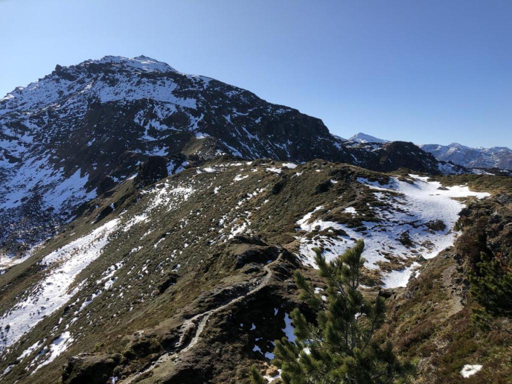 Nun liegt auch unser Ziel schon vor uns (im Bild auf kleine Steingipfel rechts oben), die Naviser Sonnenspitze. Gar nicht so weit wirkt dieser Punkt von hier…