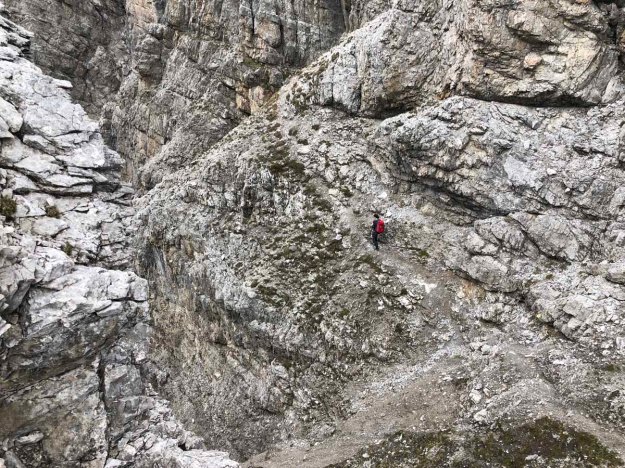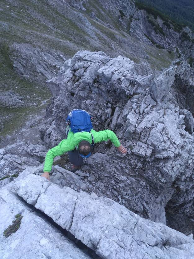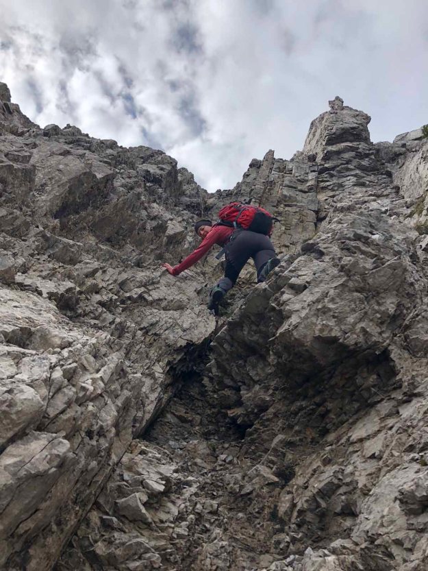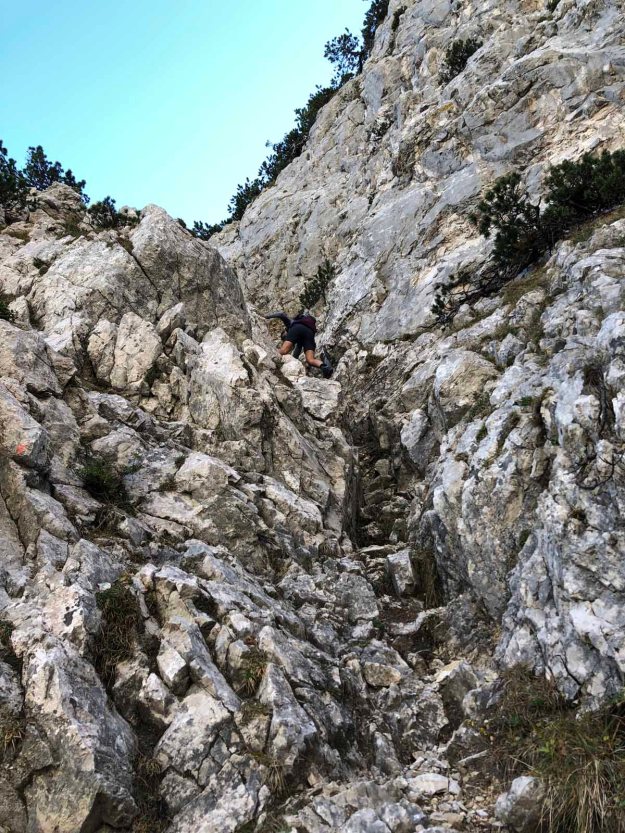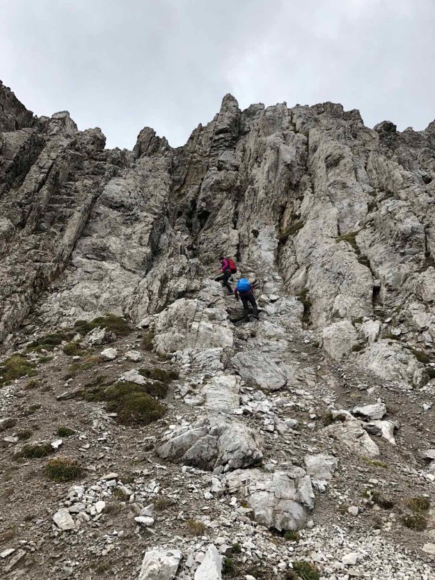 Bald erreichen wir den schwierigsten Teil der Tour, eine Geröllflanke mit Drahtseilversicherung. Nicht wirklich arg, aber auf die Tour bezogen wohl das Anspruchsvollste.