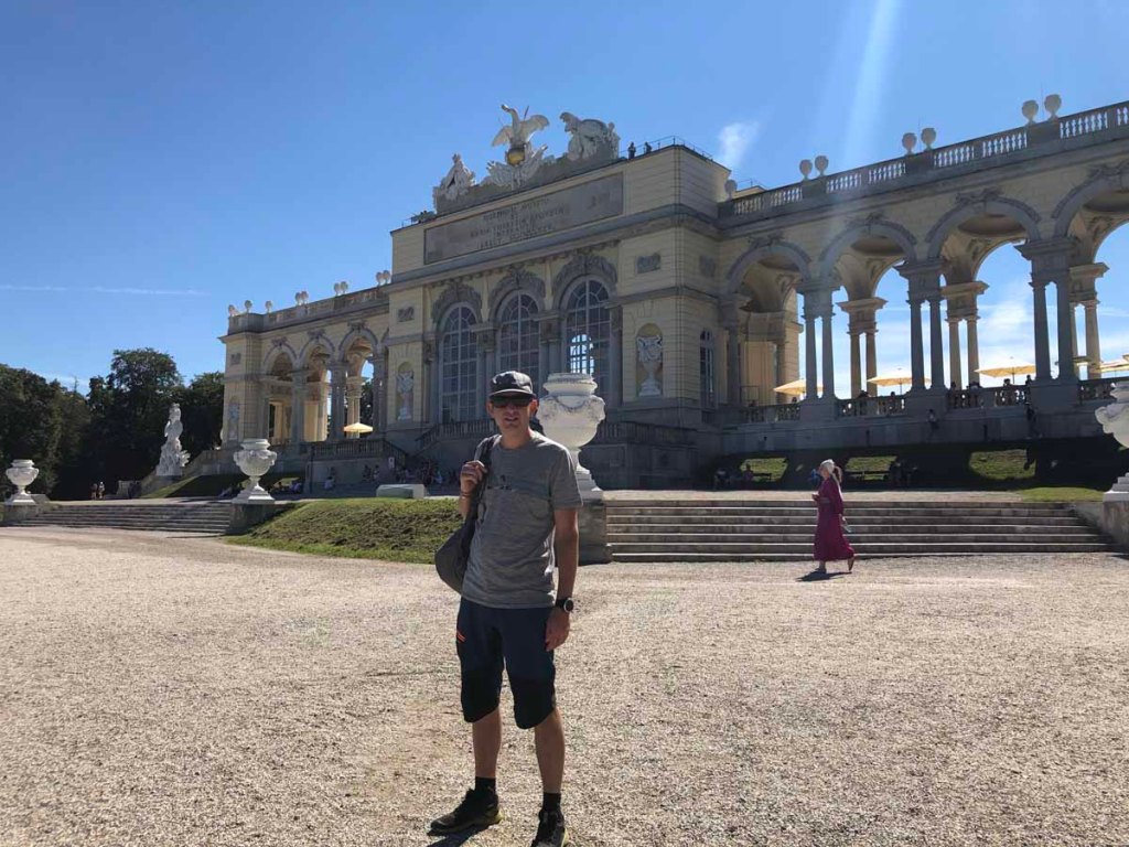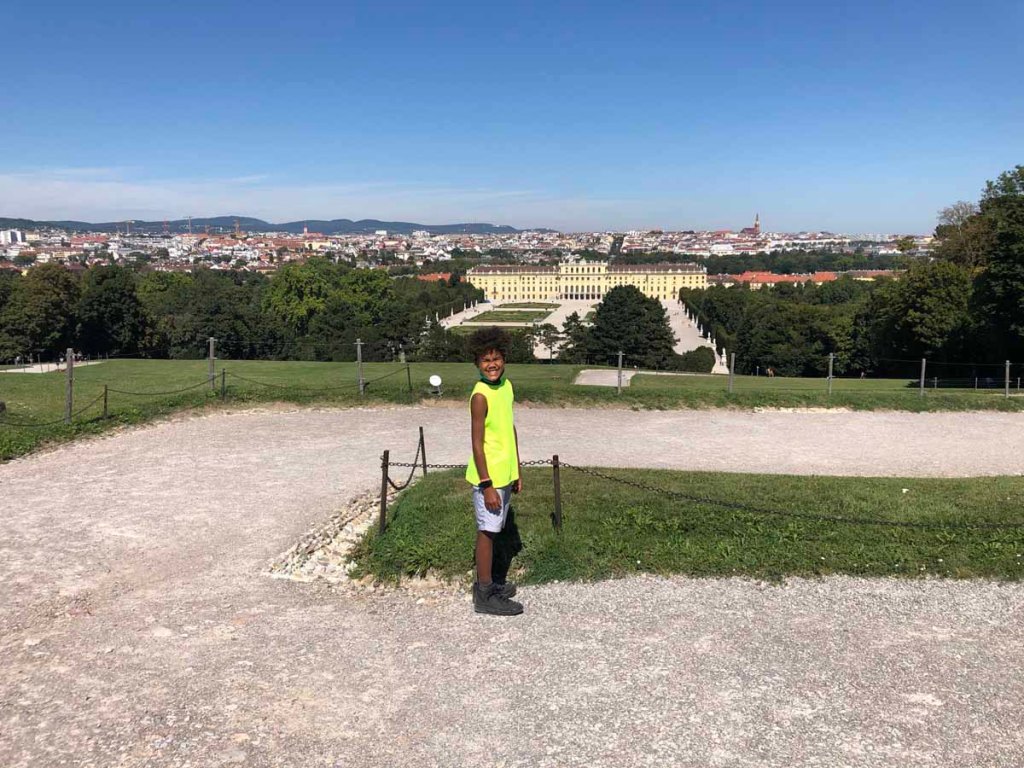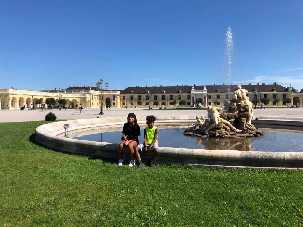 Wir kommen von Westen her zum Schloss, biegen dann aber gleich in Richtung Neptun-Brunnen und Gloriette ab. Sara ist schon ein wenig müde, daher setzt sie sich in den Schatten, während Letu und ich zur Gloriette aufsteigen. Von hier haben wir einen sehr schönen Ausblick auf das Schloss Schönbrunn.