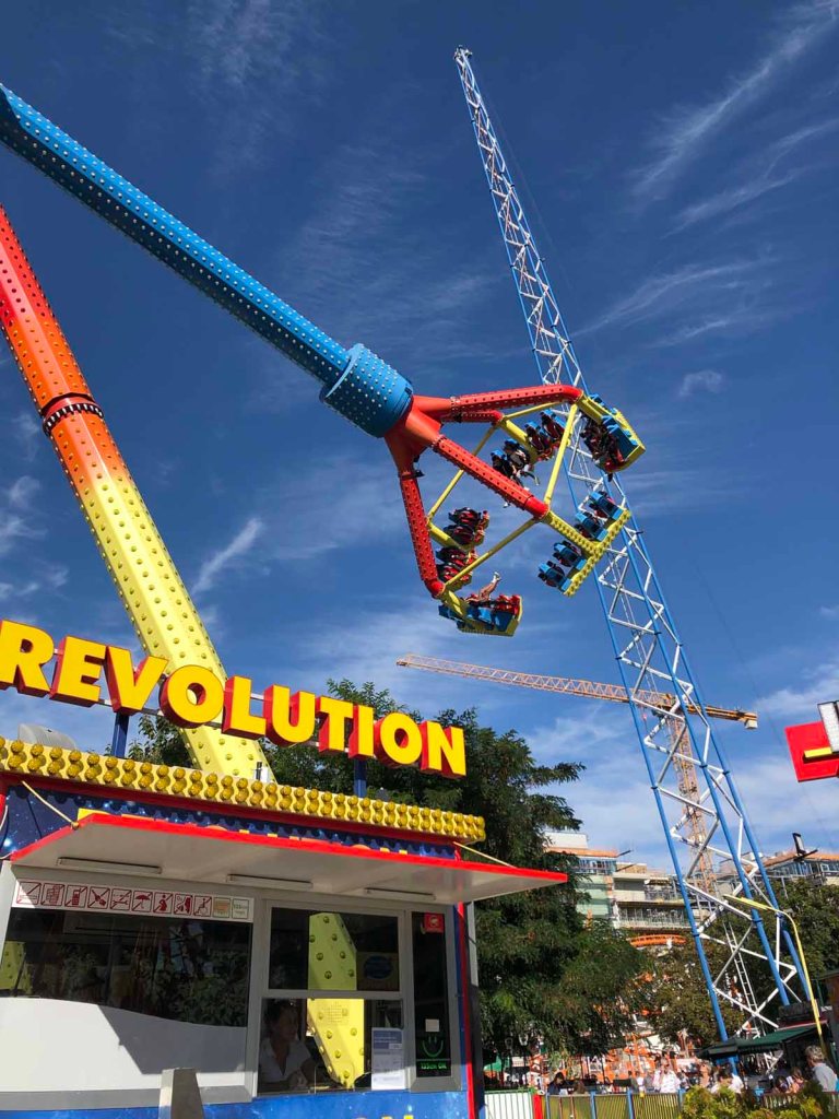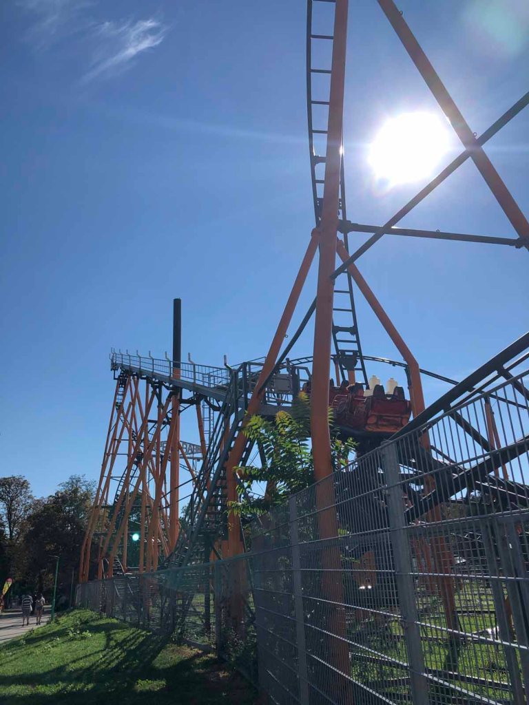 Zwischendurch setzen wir uns in eines der vielen Lokale, trinken etwas und schauen entspannt dem Treiben zu. Dann dürfen die Kinder noch eine Attraktion aussuchen, es wird einstimmig die Achterbahn, die sie an Superman erinnert. Im Liegen geht es durch die Kurven und Loopings.