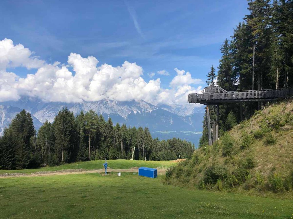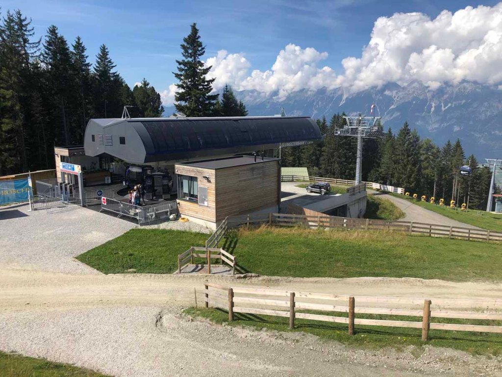 Dazu fahren wir mit der neuen Glungezerbahn, sogar in der richtigen Gondel (Aldrans) hinauf zur Mittelstation. Hier stehen wir dann vor der großen Baustelle…