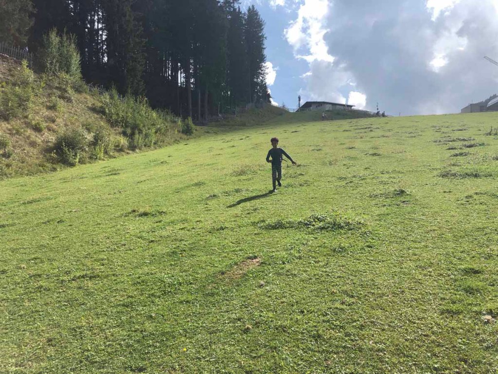 Sara macht ein kleines Lagerfeuer und setzt sich mit einem Buch in die Wiese. Mama und Papa verlassen uns nun, wir bleiben heute Nacht „heroben“. Letu und ich beschließen spontan, Mama ins Tal zu begleiten, während Papa mit dem Mountainbike abdampft.