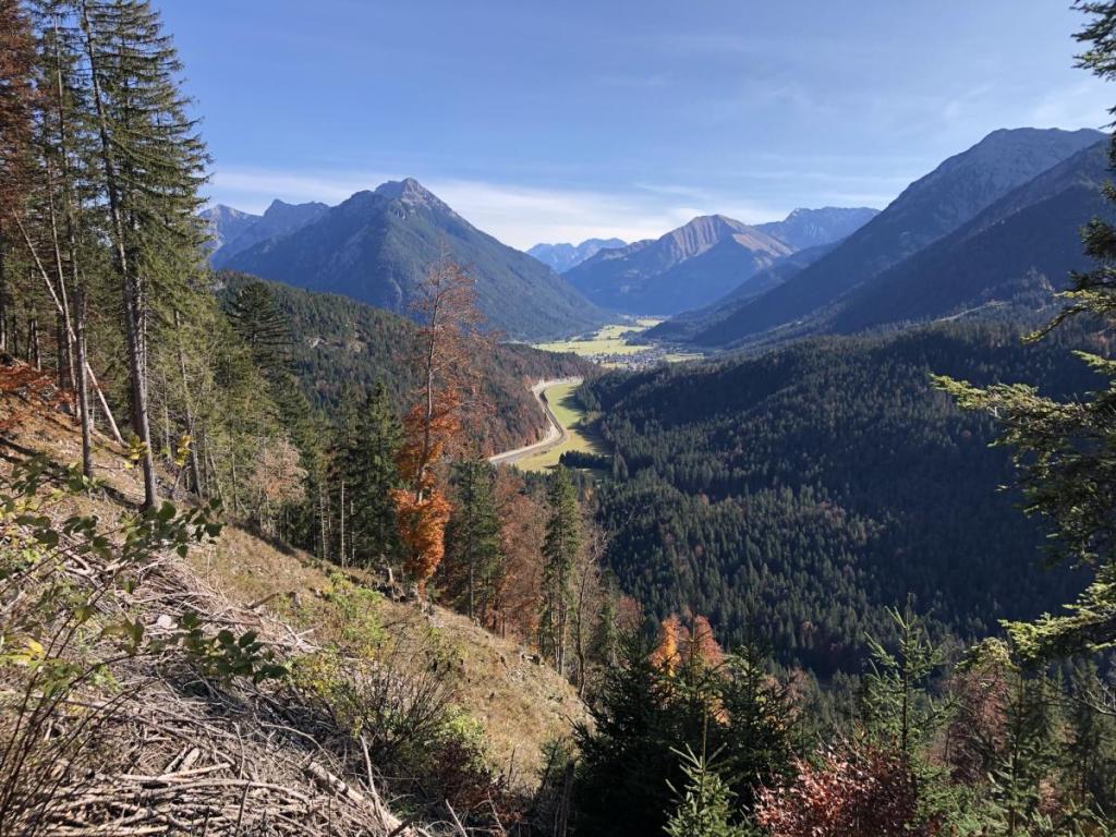 Am Forstweg angelangt, beschließen wir spontan, den Weg über das Pflacher Älpele zu nehmen. Ein Blick zurück bringt den Pilgerschrofen und die Zwölf Apostel ins Blickfeld… vielleicht schaffe ich diese zwei Ziele heuer…