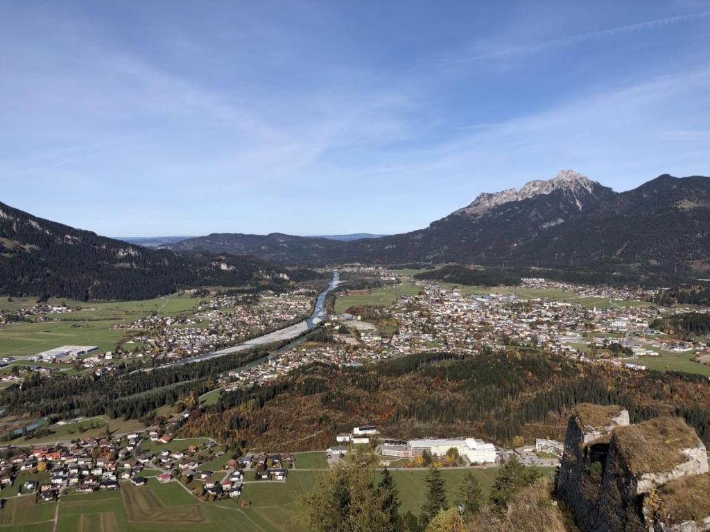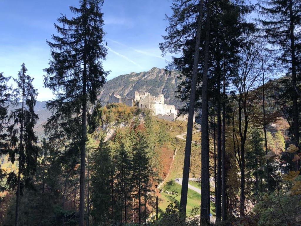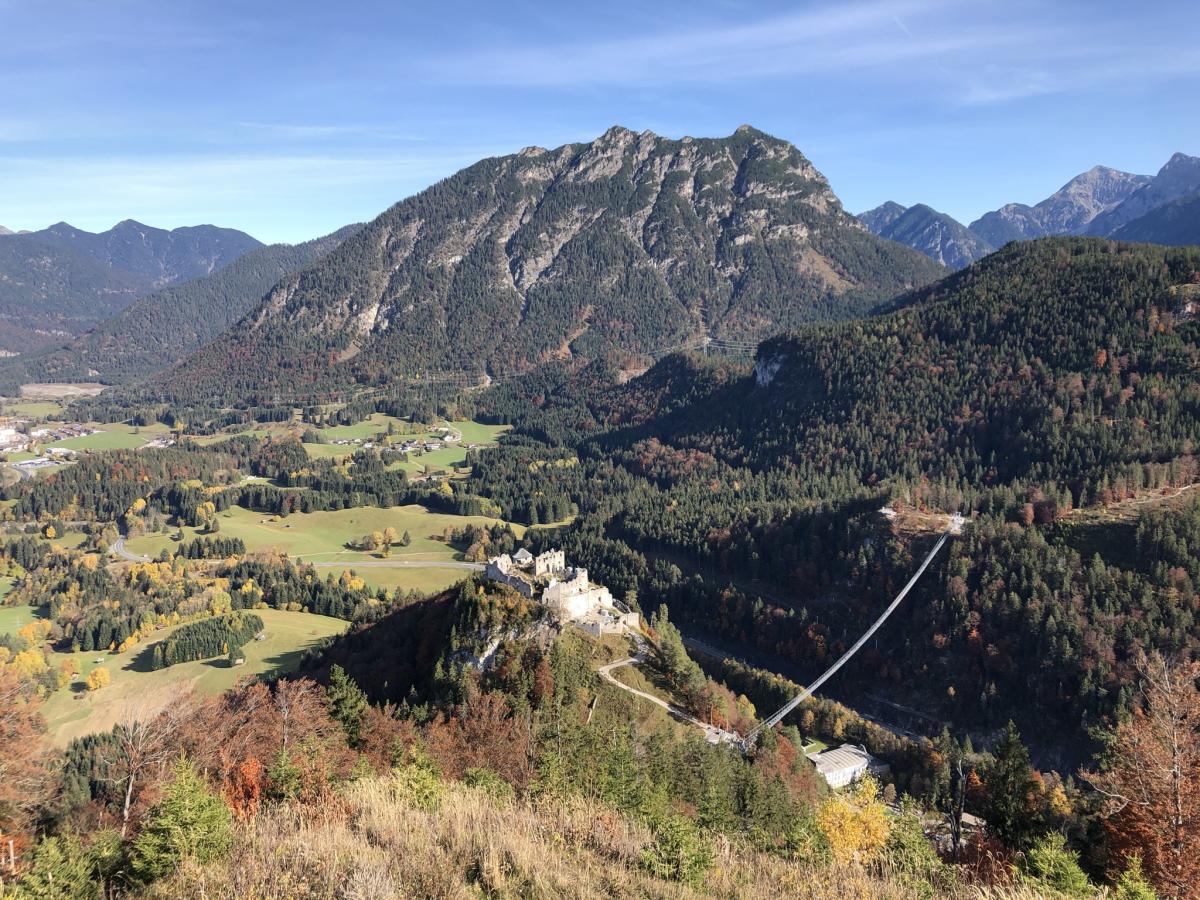 Da wir nun auf dem höchsten Punkt stehen, können wir die Burg Ehrenberg und gleich daneben die Highline 179 sehen. Der dominierende Berg im Hintergrund der Burg ist der Tauern (1.841m), obwohl nicht sehr spektakulär anzusehen, eine feine Bergtour mit teils recht steilen Stellen.