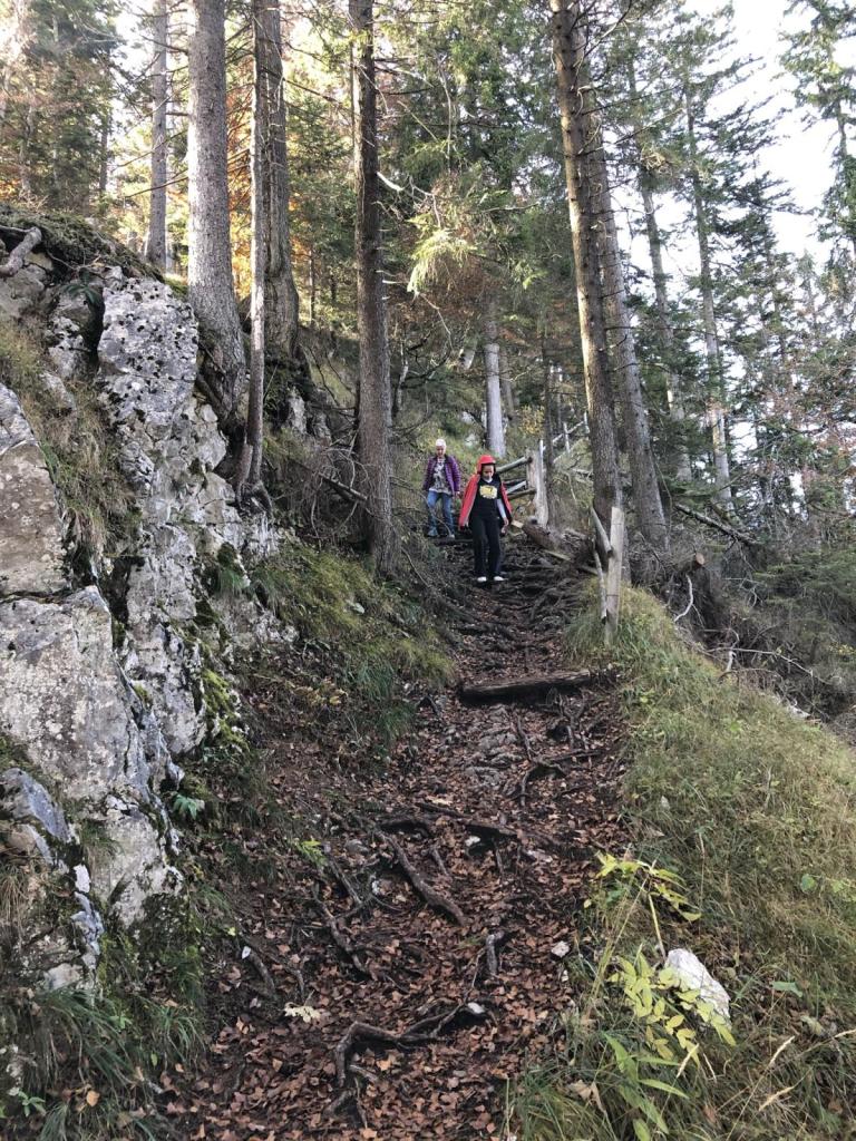Der Steig führt gut ausgebaut, aber steil hinab ins Tal. Stellenweise müssen wegen Vereisung aufpassen, die Sonne scheint hier doch noch nicht überall hin.