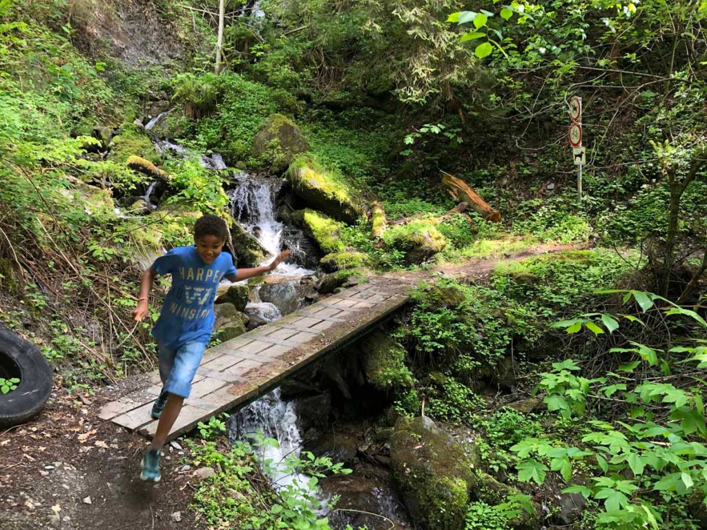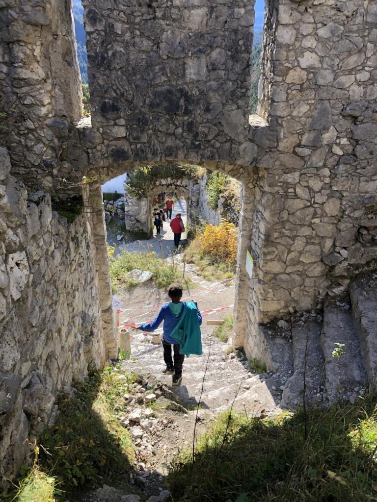Der Abstieg von der Burg zur Highline ist schnell erledigt, die Kinder sind nun schon gespannt auf die Hängebrücke.