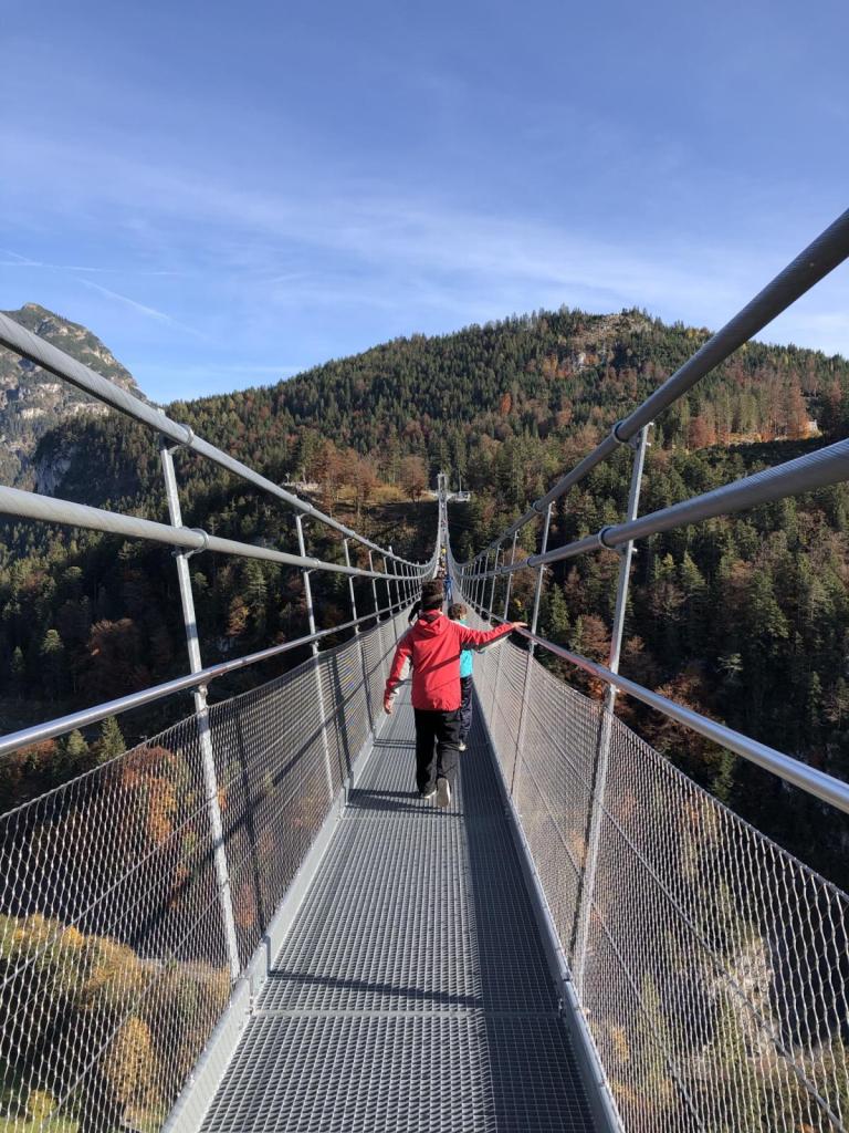 Obwohl wir schon einmal über die Brücke gegangen sind, ein paar Jahre ist das her, ist es wieder sehr aufregend. Spektakulär überquert das wackelige Konstrukt die Fernpassstraße und endet auf der Seite von Fort Claudia. Der Blick durch den Gitterrost in die Tiefe läßt so manchen Besucher schaudern.