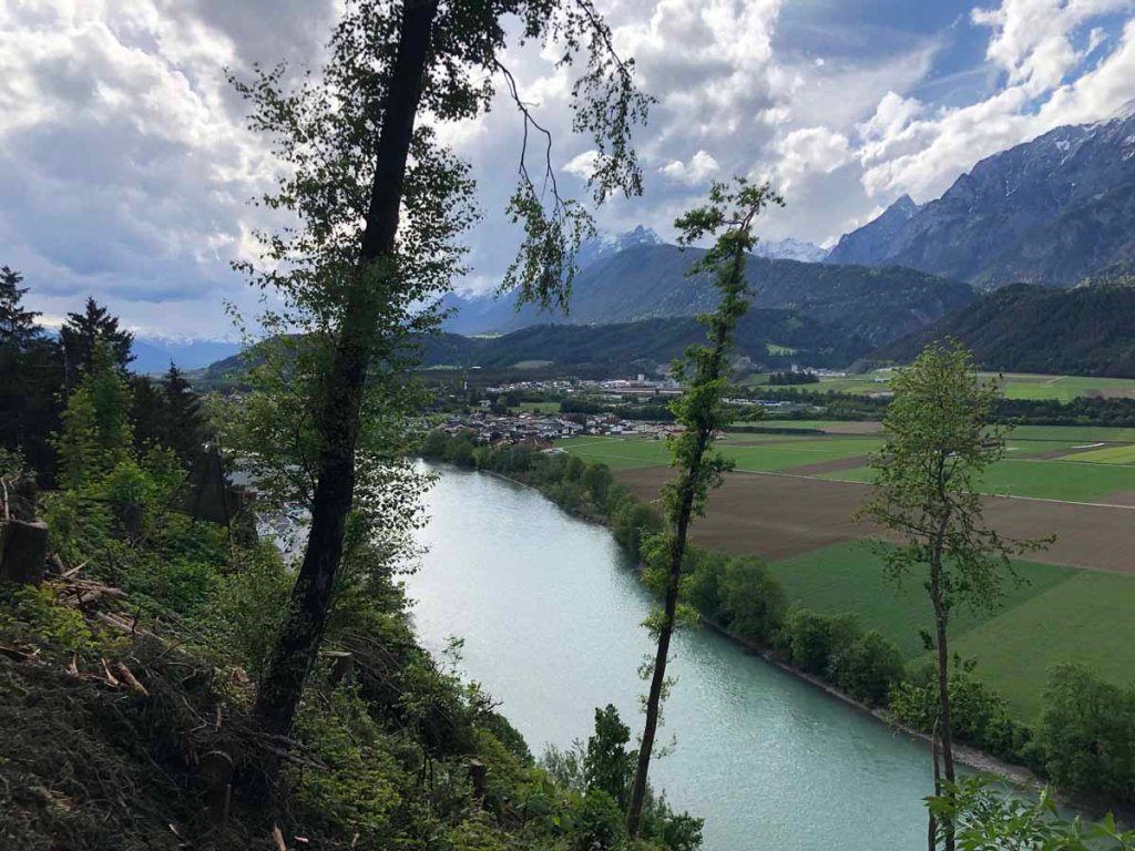 Kurz bevor wir Pill wieder erreichen, machen wir noch eine Verschnaufpause und genießen das Panorama, das sich uns bietet… im Vordergrund der Inn, im Hintergrund das Karwendel.