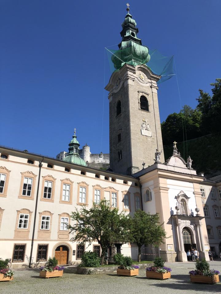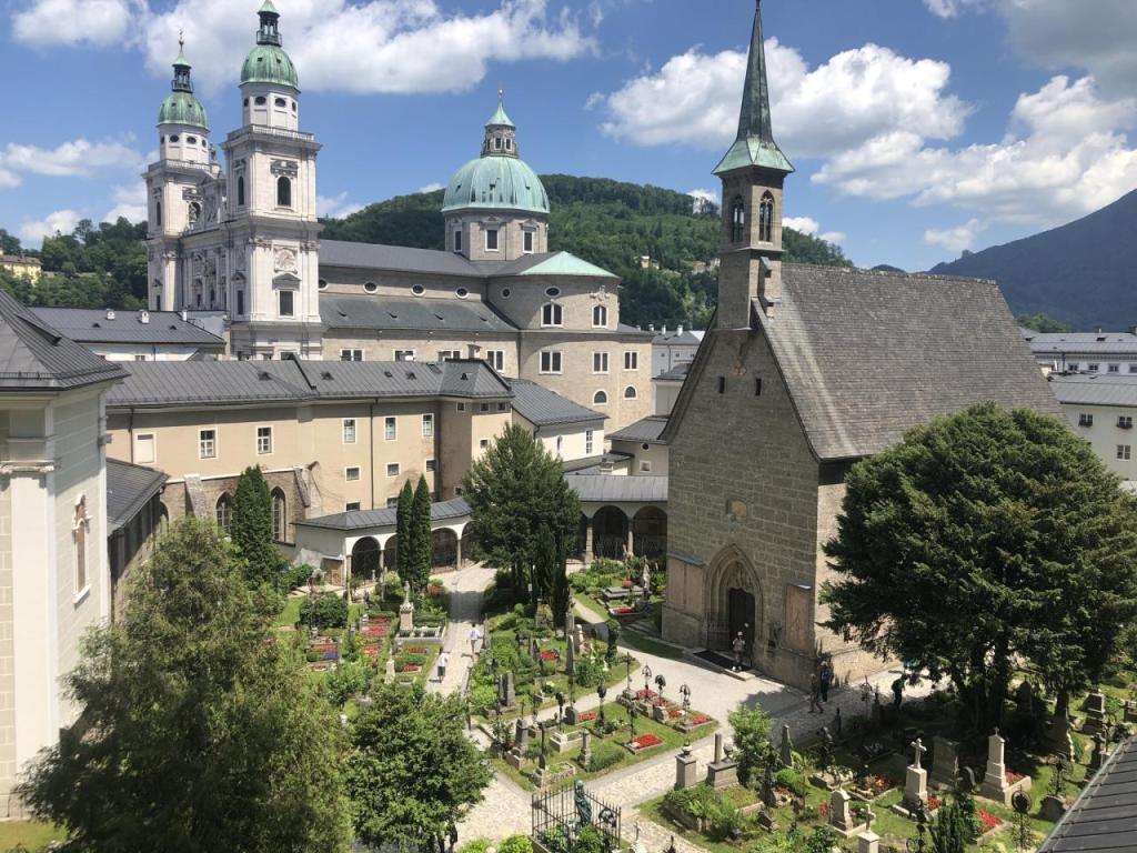 Der Ausblick aus dem Fenster der Kapelle ist wunderschön, im Vordergrund der Friedhof, im Hintergrund der Dom zu Salzburg.