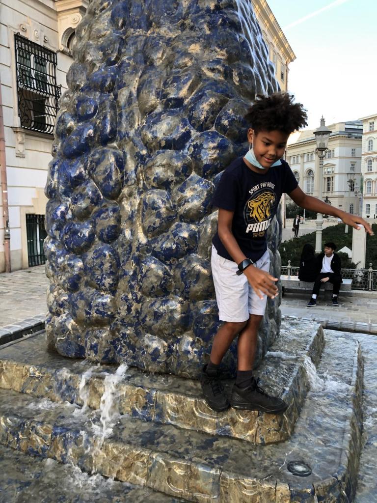 Wir genießen unseren Kaffee, rasten ein wenig. Langsam werden wir müde, es wird Zeit, den Retourweg anzutreten. Am Nachhauseweg kommen wir noch an Wasserwellen-Lebensbrunnen vorbei. Dieser schöne Brunnen wurde aus dem größten Lapislazuli-Monolithen, das jemals gefunden wurde, geformt. Überall schimmert dieses unvergleichliche Blau am Brunnen heraus, ein wunderschönes Stück Kunst.