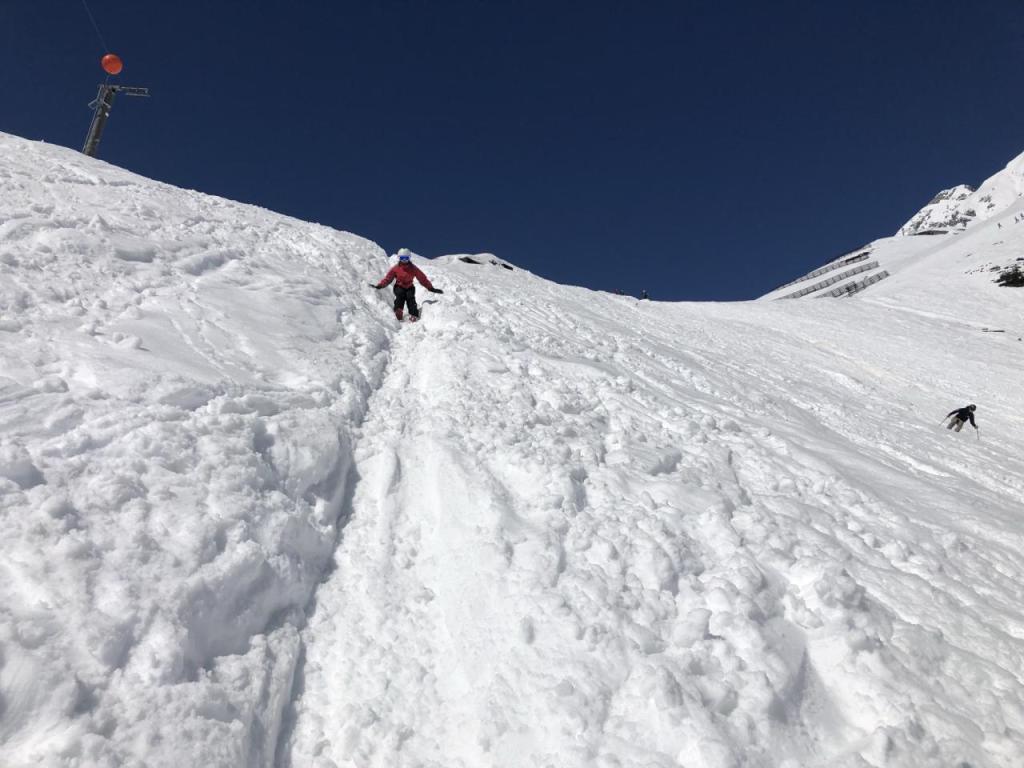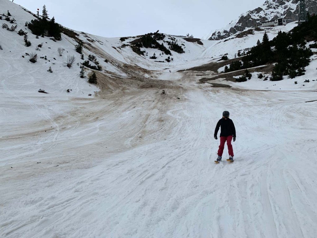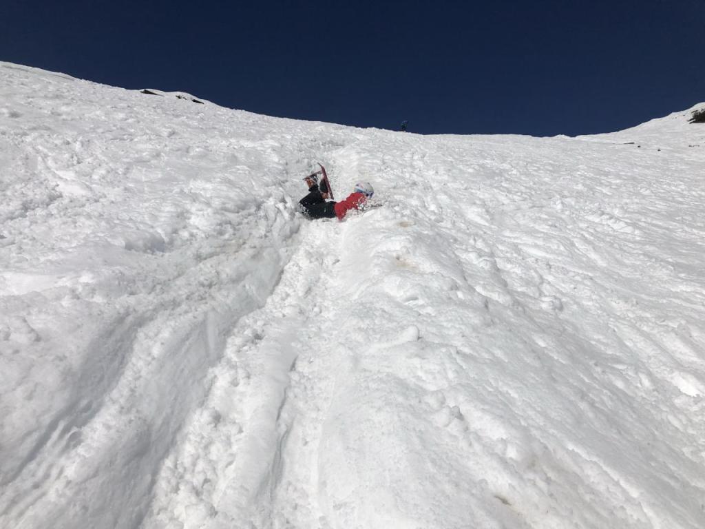 … aber der Schnee ist super weich und die Sonnen schein zumindest im oberen Bereich noch auf die Rinne. Das muss einfach Spaß machen!