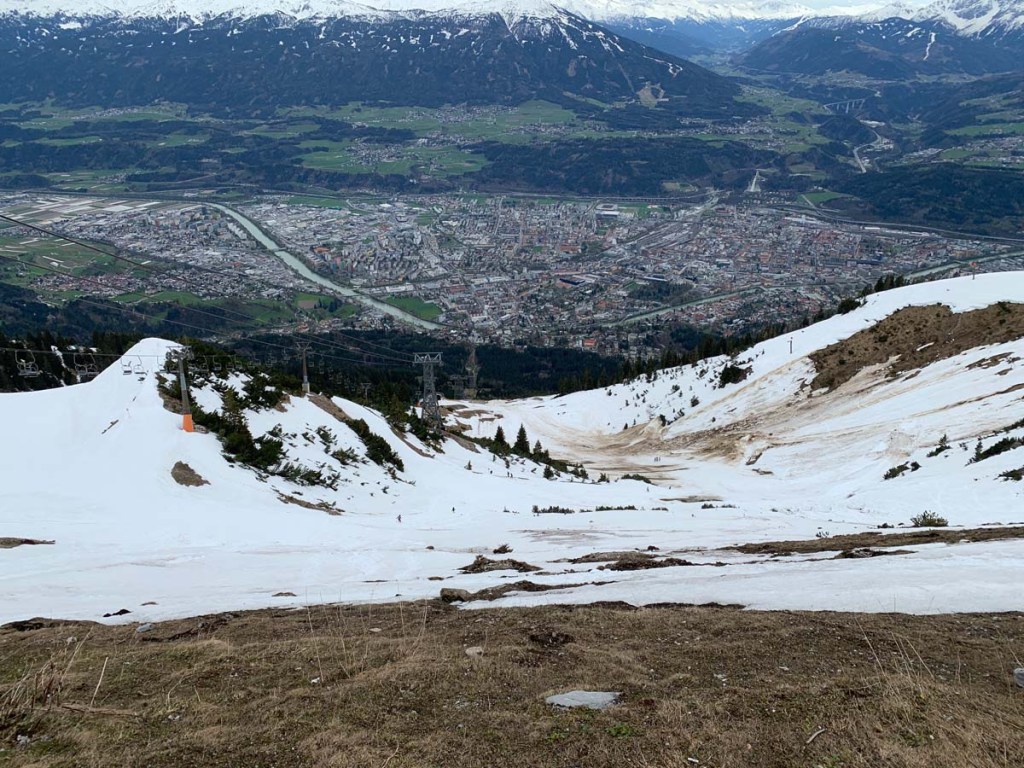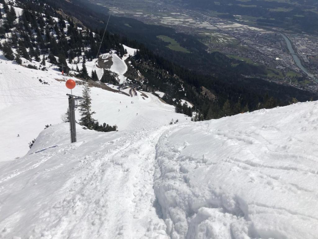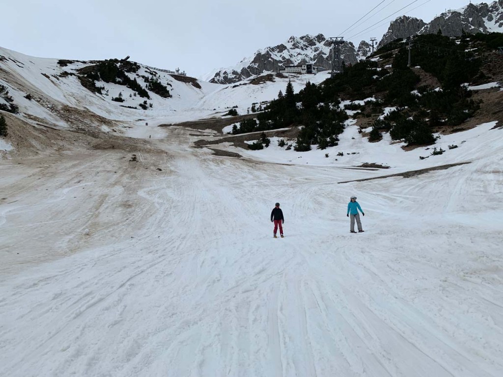 Wir statten dem Gipfel nur einen kurzen Besuch ab, dann wandern wir nach Südwesten, zur Mairrinne. Diese im Winter bekannte Tourenvariante wollen wir mit den Figln abfahren. Viel Schnee wird nicht mehr liegen, aber vielleicht reicht es aus.