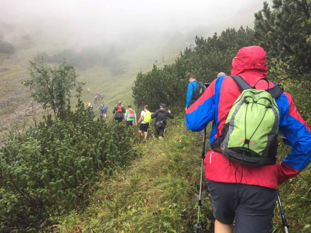Die letzten Höhenmeter machen wir in einer undurchsichtigen Nebelbank, leider haben wir keinen Ausblick auf die umgebende schöne Bergwelt.