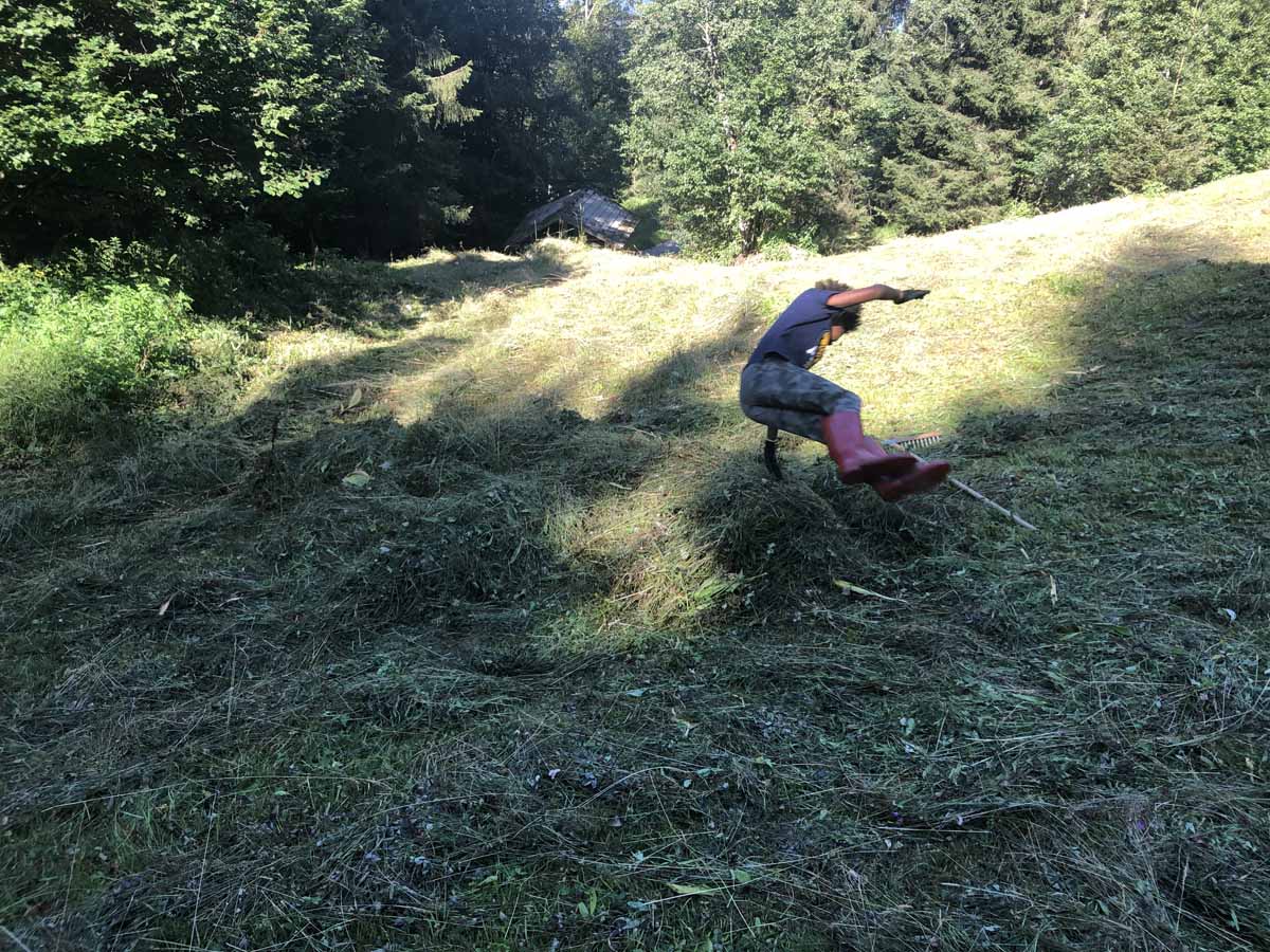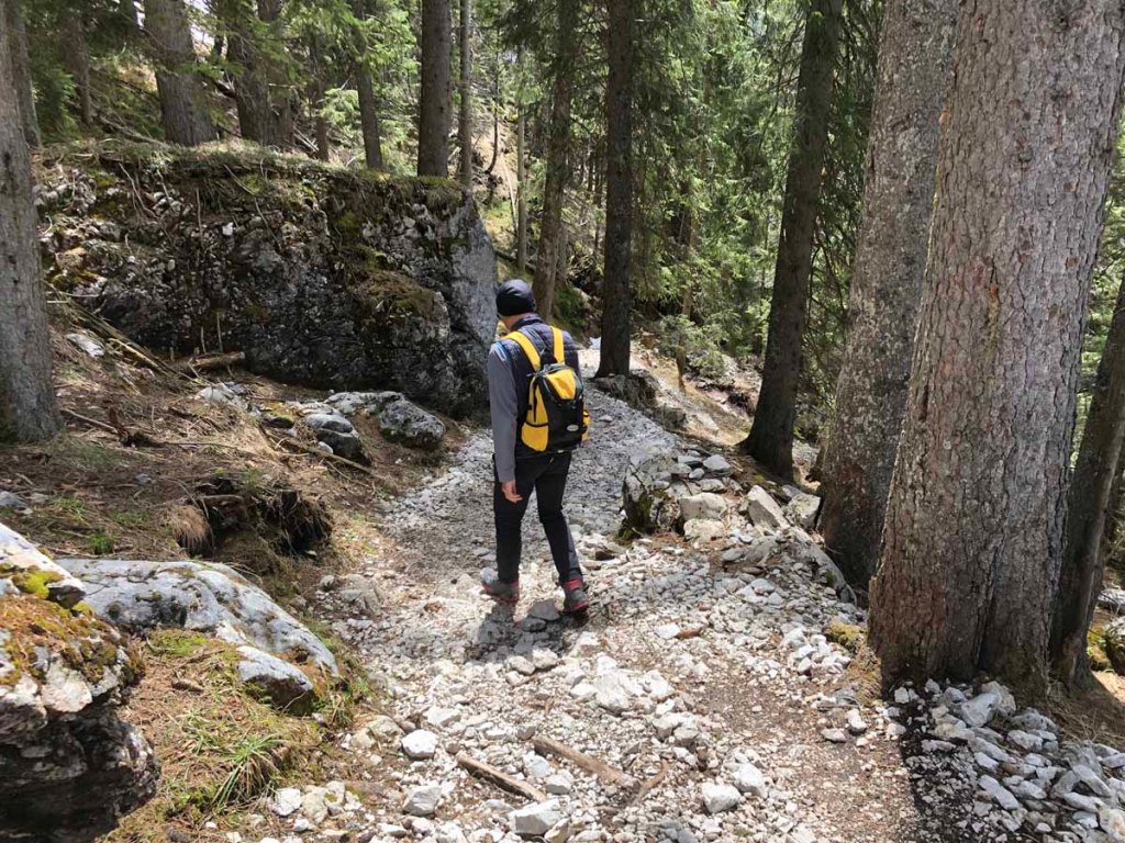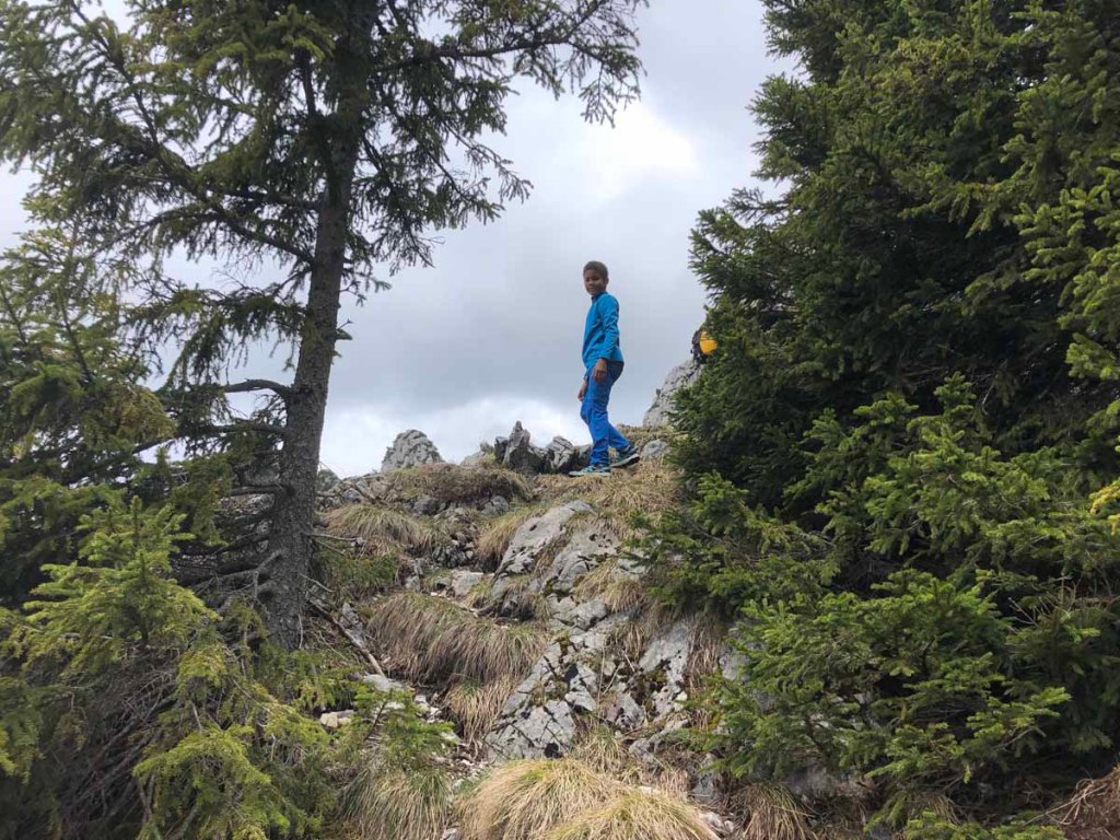 Am Morgen haben wir mit Papa ausgemacht, auf das Säulinghaus zu wandern. Sara bleibt in der Hütte, während Letu und ich mitgehen. Von der Hütte starten wir ein Stück über den Forstweg, dann erreichen wir den Steig.