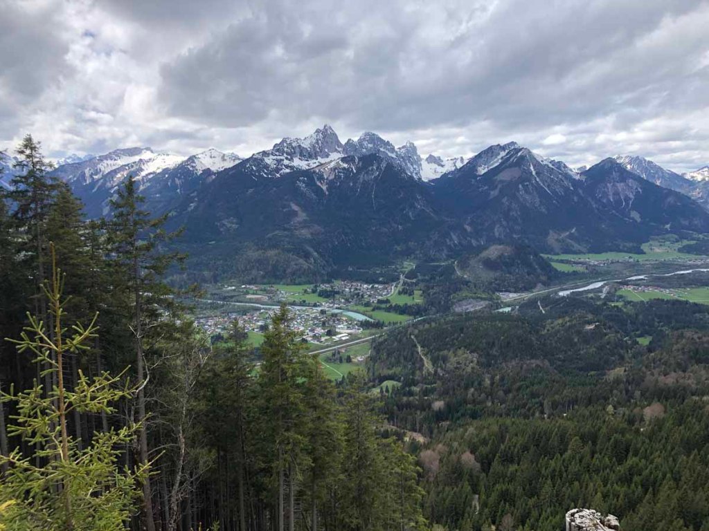 Am Forstweg angelangt, beschließen wir spontan, den Weg über das Pflacher Älpele zu nehmen. Ein Blick zurück bringt den Pilgerschrofen und die Zwölf Apostel ins Blickfeld… vielleicht schaffe ich diese zwei Ziele heuer…