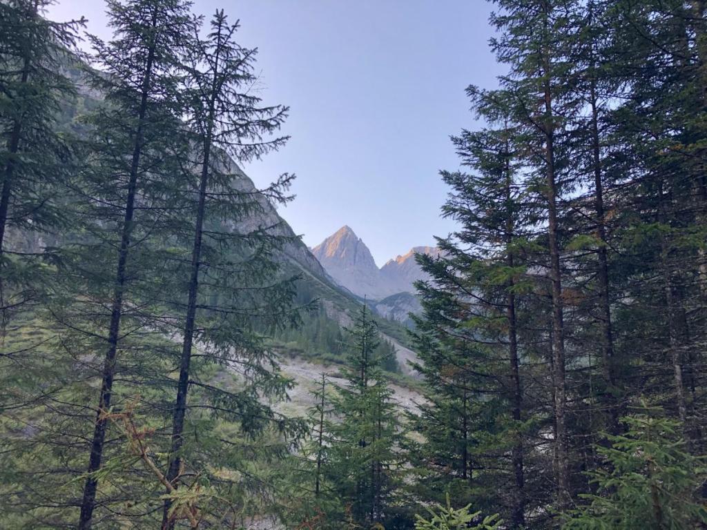 Heute steht ein besonderer Berg am Programm, die Dremelspitze im Parzinn. Wir treffen uns um 7:30 Uhr in Boden am Wanderparkplatz. Wir, das sind heute Papa, Luis und ich. Schon ziemlich am Anfang haben wir unser Ziel vor Augen, die Dremelspitze. Einer der schönesten, wenn nicht der schöne Gipfel im Lechtal.