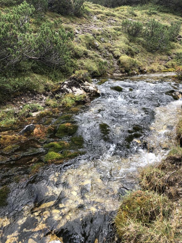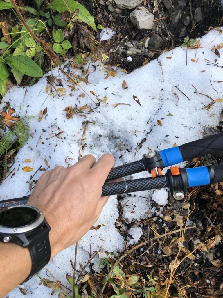 Ab hier steilt der Weg auf, ein paar Kehren führen uns hinauf auf die wunderschön gelegene Alpenvereinshütte. Kurz nach der Hütte sehen wir Reste vom gestrigen Hagelsturm, der hier durchgezogen ist.