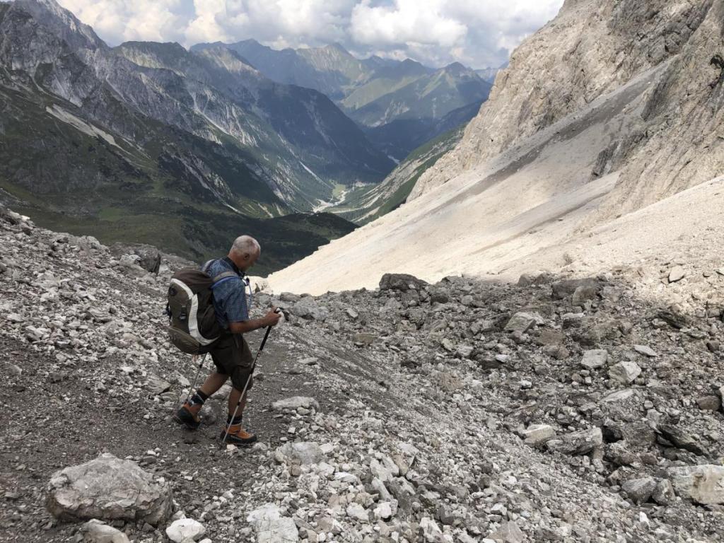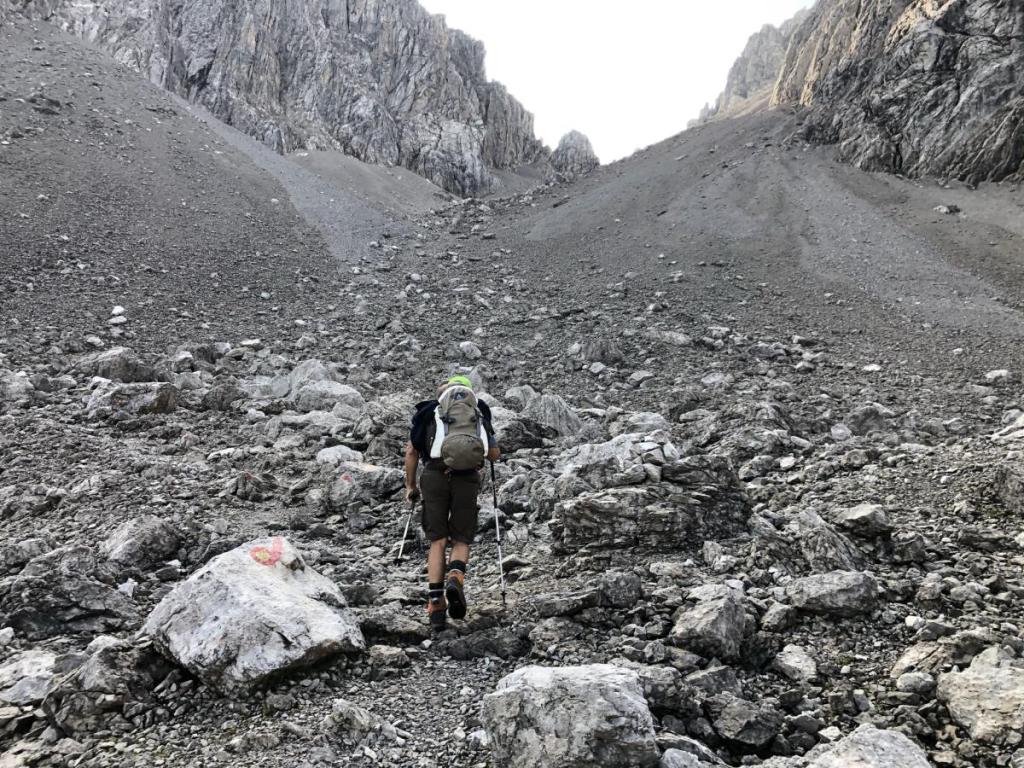 Bald erreichen wir den Fuß des Kars, das zur Scharte hochführt. Nicht immer ganz leicht, vor allem wegen des vielen feinen Schotters, erreichen wir das Ende des einfachen Weges.