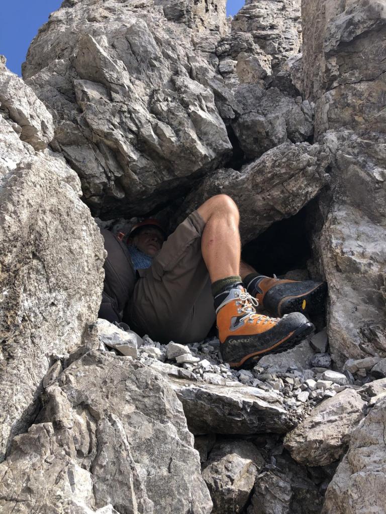 Kurz vor dem Gipfel erreichen wir die Schlüsselstelle, ein Klemmbock, den wir „unterwandern“.