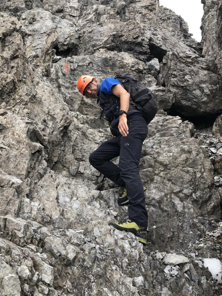 Die Rinnen im Abstieg lassen sich gut meistern, die schwierigere Stelle mit dem Band schaffen wir auch gut, wohlgemerkt mit ein paar Verrenkungen.