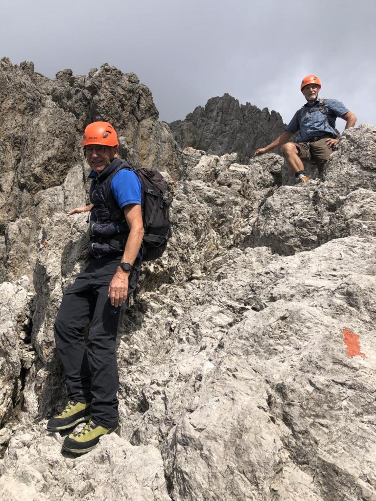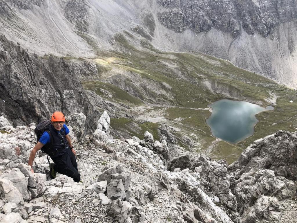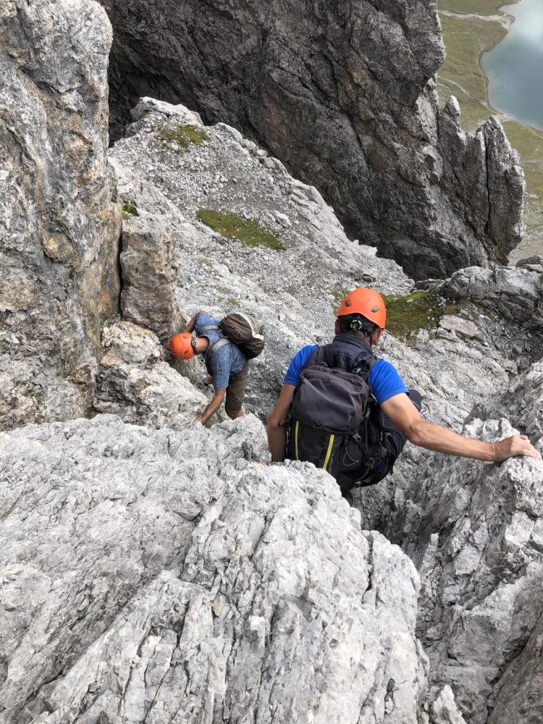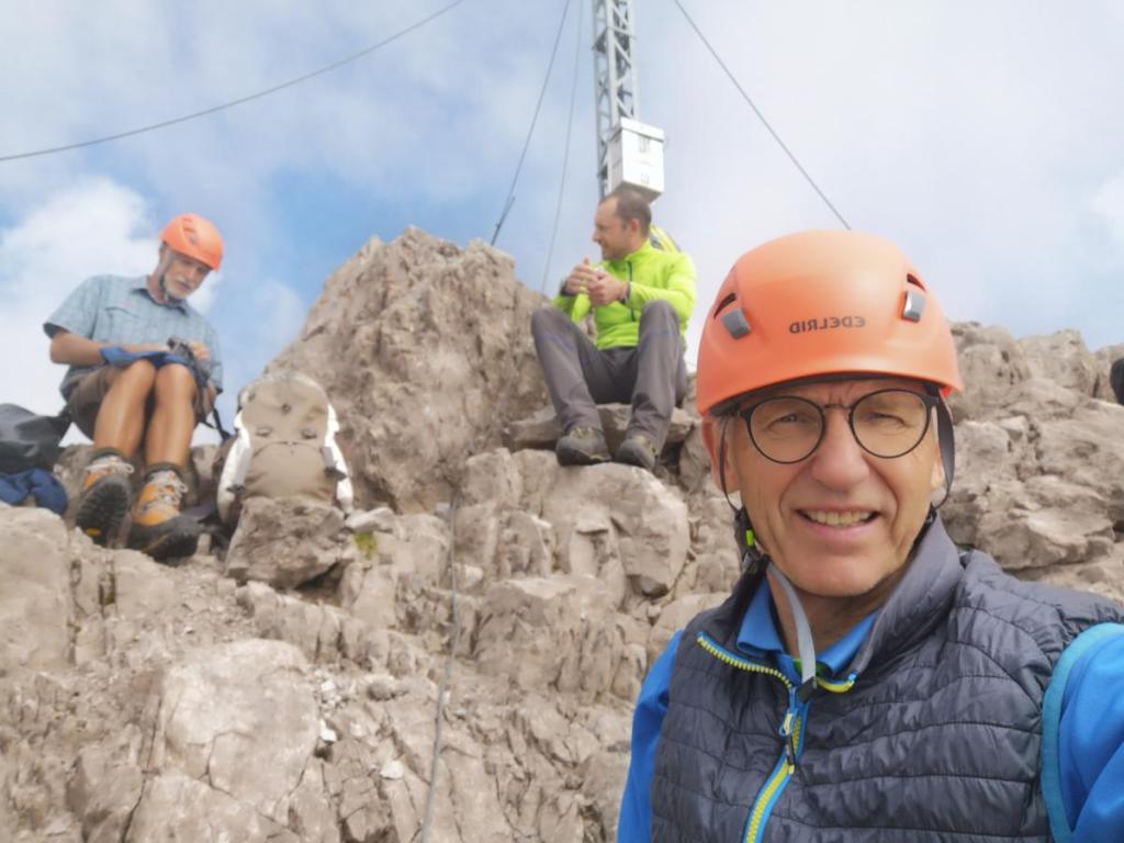 Wir genießen die Pause, Brotzeiten und fotografieren. Dann bereiten wir uns wieder mental auf den Abstieg vor. Ein paar knifflige Stellen erwarten uns.