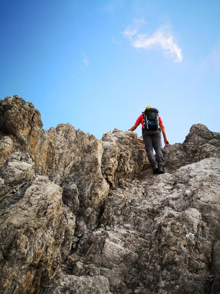 Rinnen, Bänder und kleine Grate wechseln sich ab, es wird nie langweilig. Trotz gegenteiligem Anschein ist der Felsen recht kletterfreundlich, heißt nicht so brüchig, wie er erscheint.