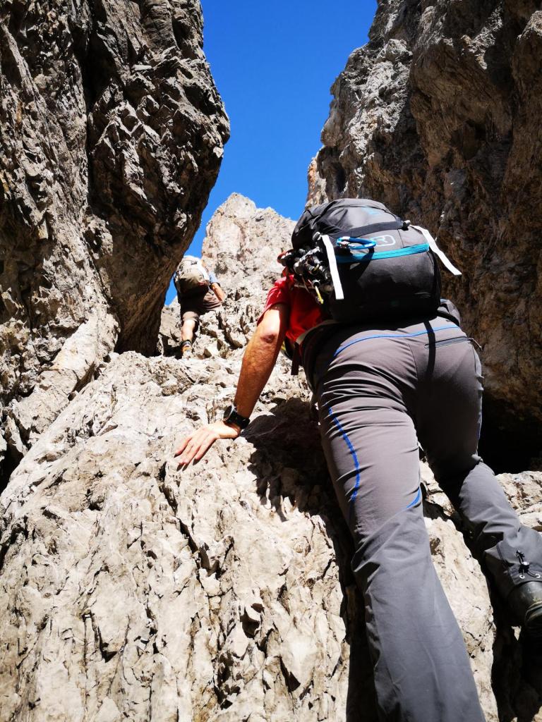 Nun geht es ans Eingemachte. Zuerst müssen wir ein paar Meter ein Schotterband hochsteigen, dann kommt schon die erste, relativ leichte, aber nasse Rinne hochklettern.