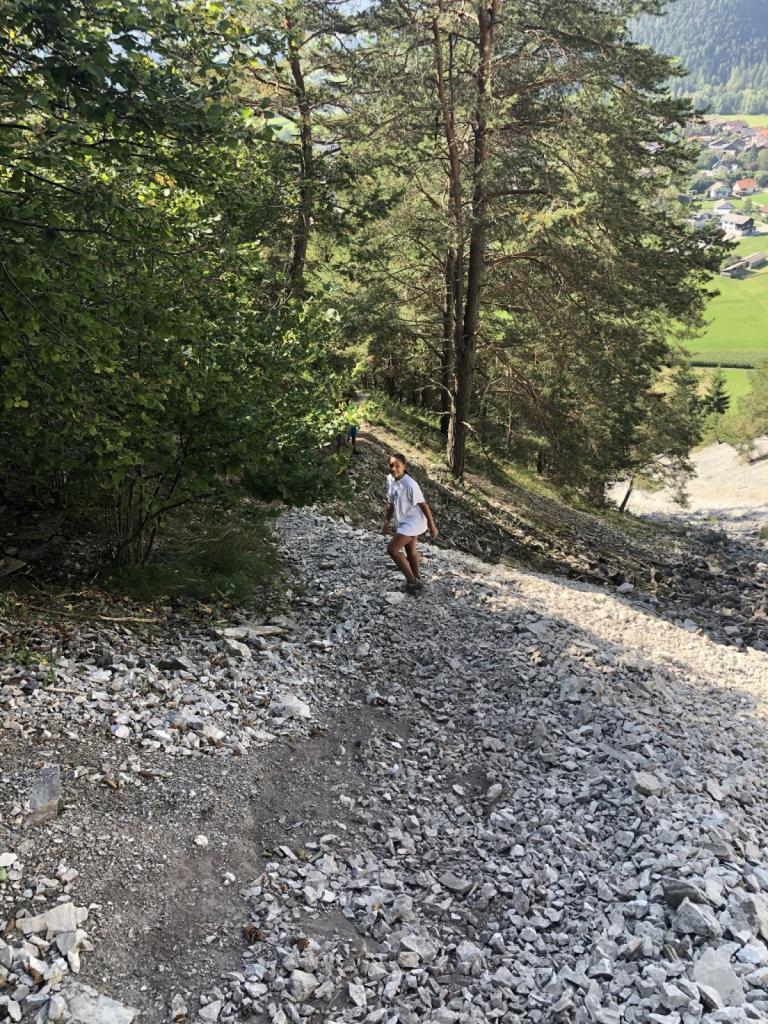 Hier trinken wir nochmals einen Schluck, dann wandern wir das letzte Grat hinab, das durch das Stahlseil eher mühsam zu begehen ist.