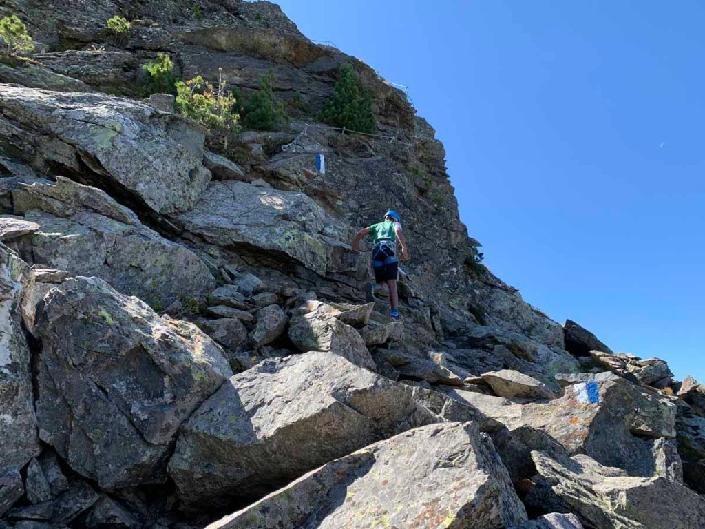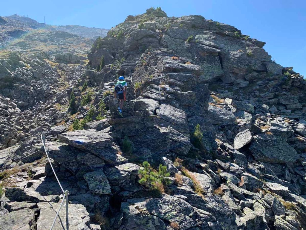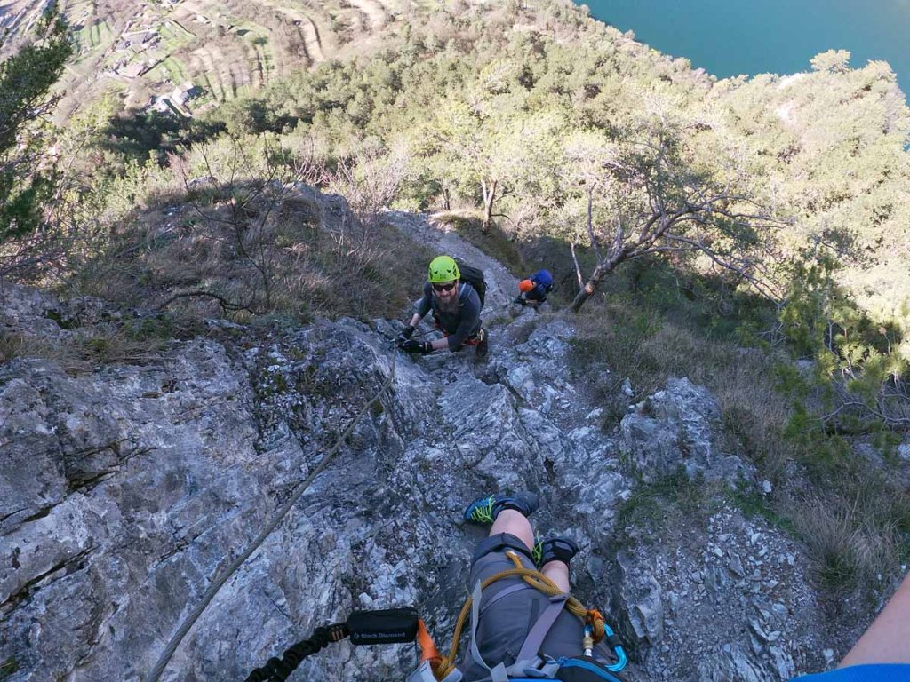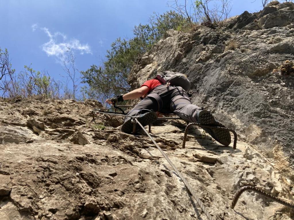 Die Via Ferrata zieht meist unschwierig am Grat entlang, ein paar Mal sind kniffligere Stellen eingebaut. Der Stau am Anfang hat sich aufgelöst, nun sind wir die meiste Zeit ohne Stockungen am Weg.