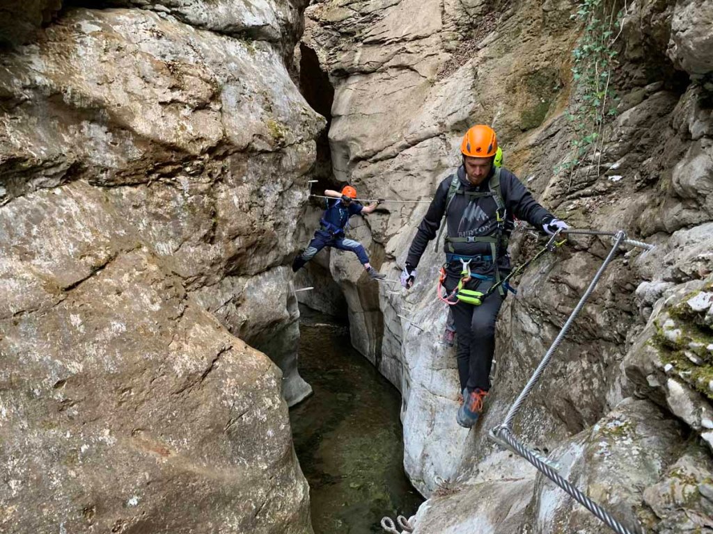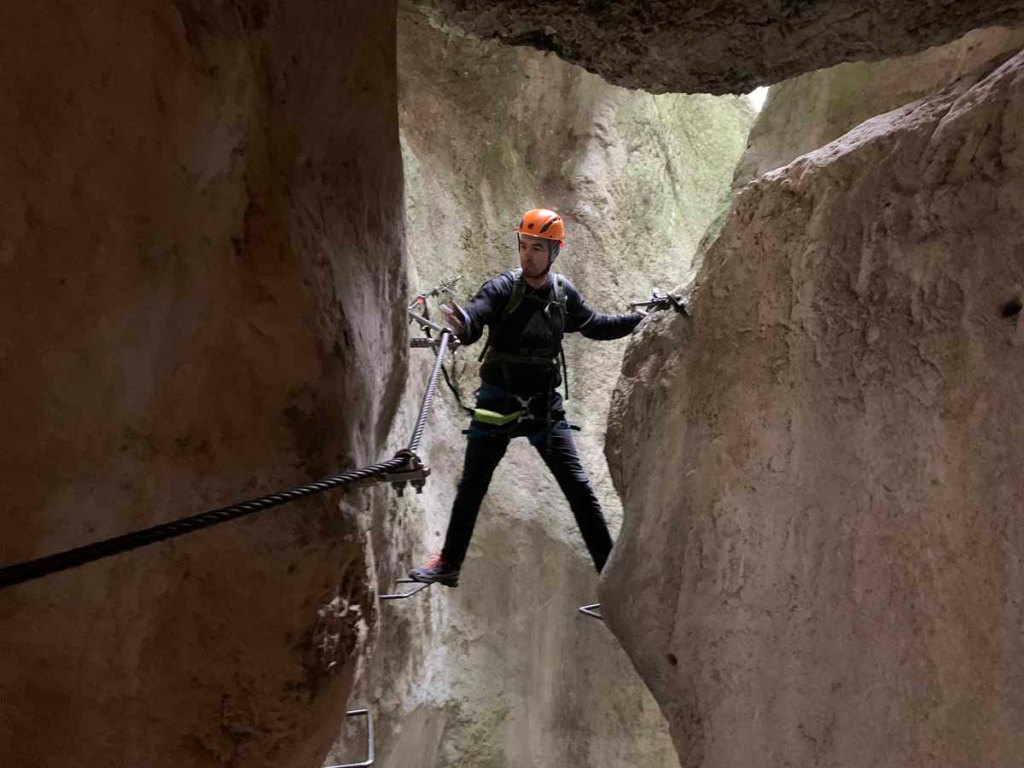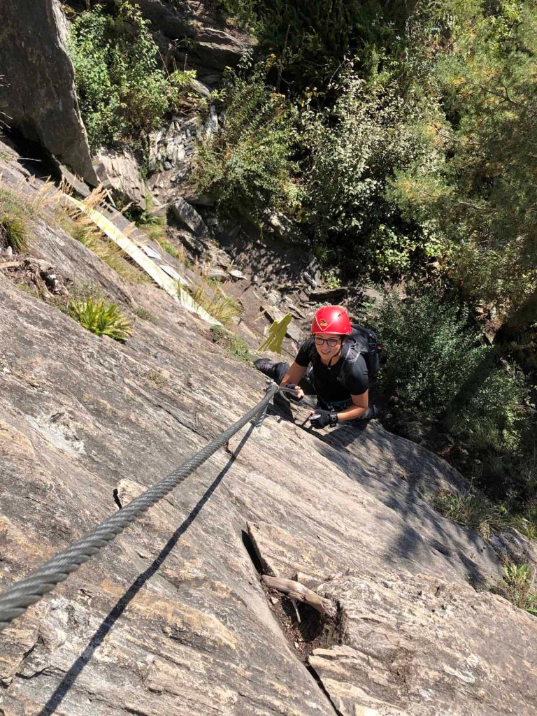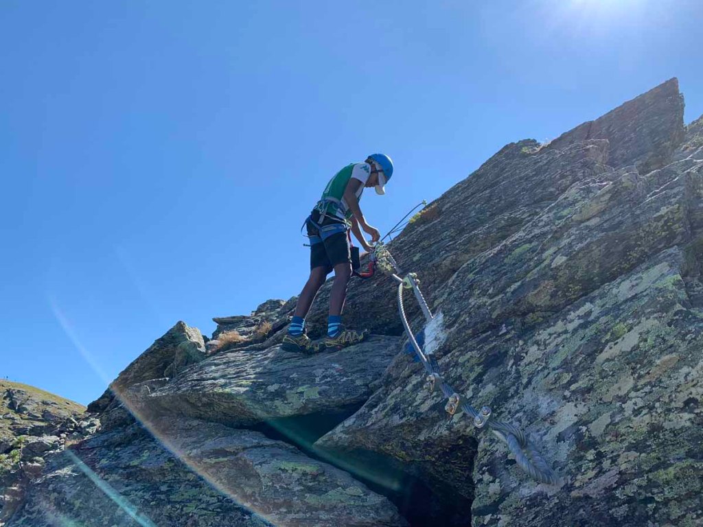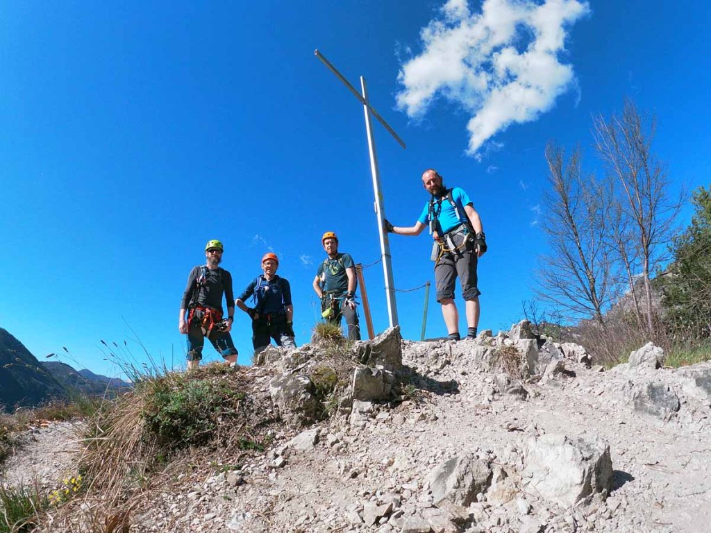 Die Via Ferrata zieht meist unschwierig am Grat entlang, ein paar Mal sind kniffligere Stellen eingebaut. Der Stau am Anfang hat sich aufgelöst, nun sind wir die meiste Zeit ohne Stockungen am Weg.