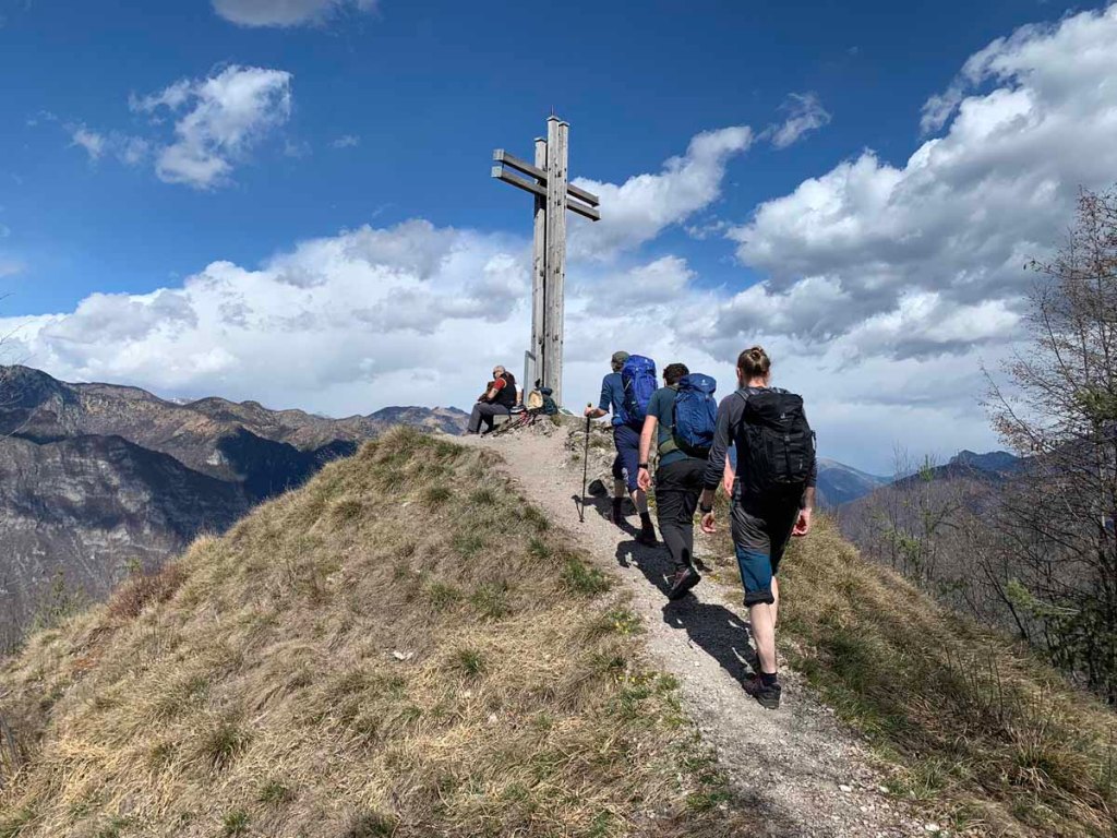 Schlussendlich erreichen wir den langen Sattel, hier können wir nun Gurt und Klettersteigset einpacken, die Kletterpassagen sind hinter uns.