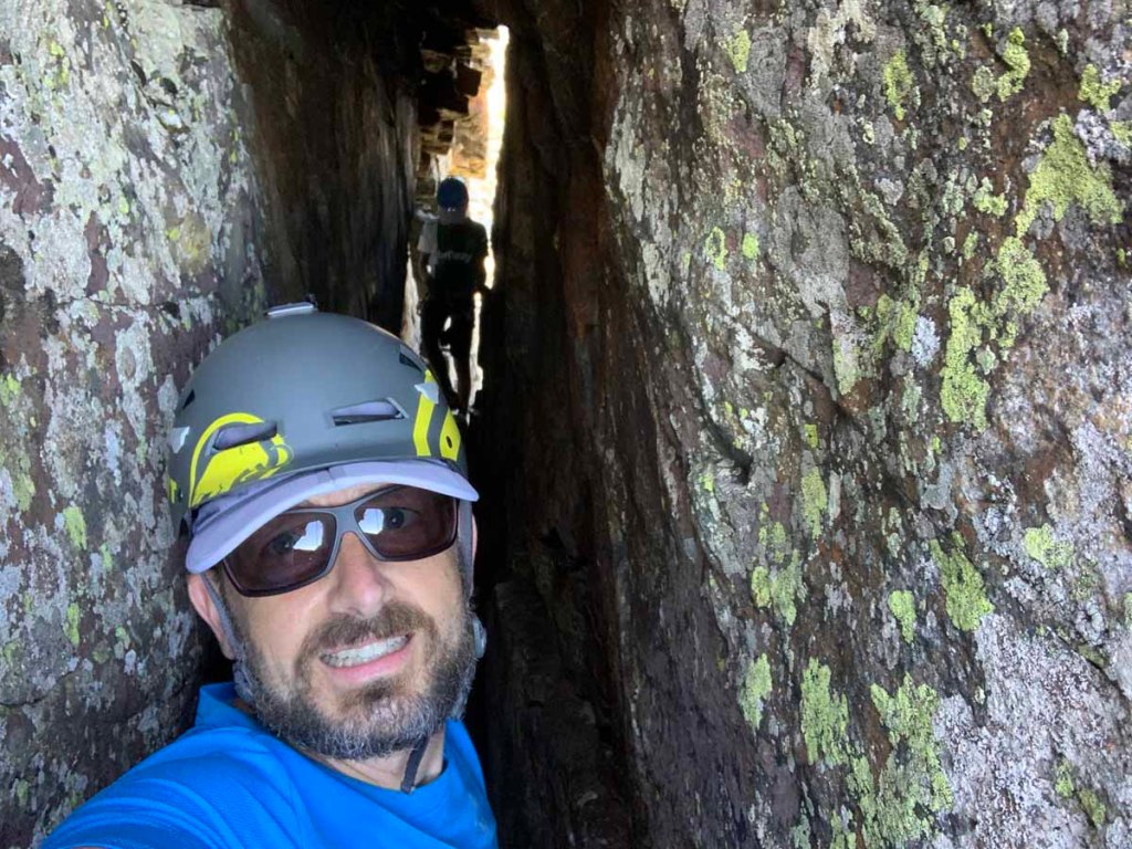 Kurz nach diesem Gipfel müssen wir eine Scharte ab- und wieder aufsteigen, dann wandern wir wieder am Grat entlang.