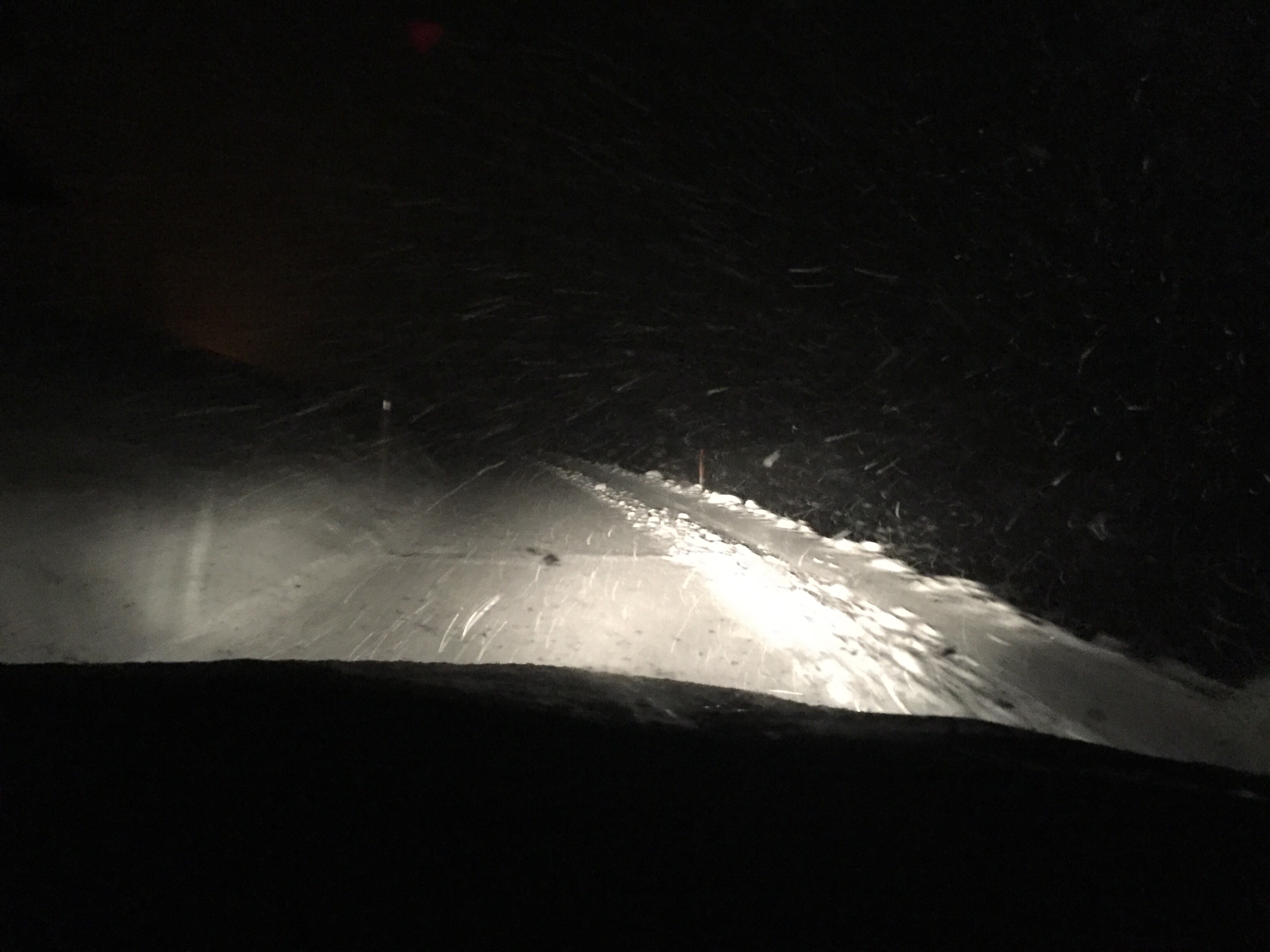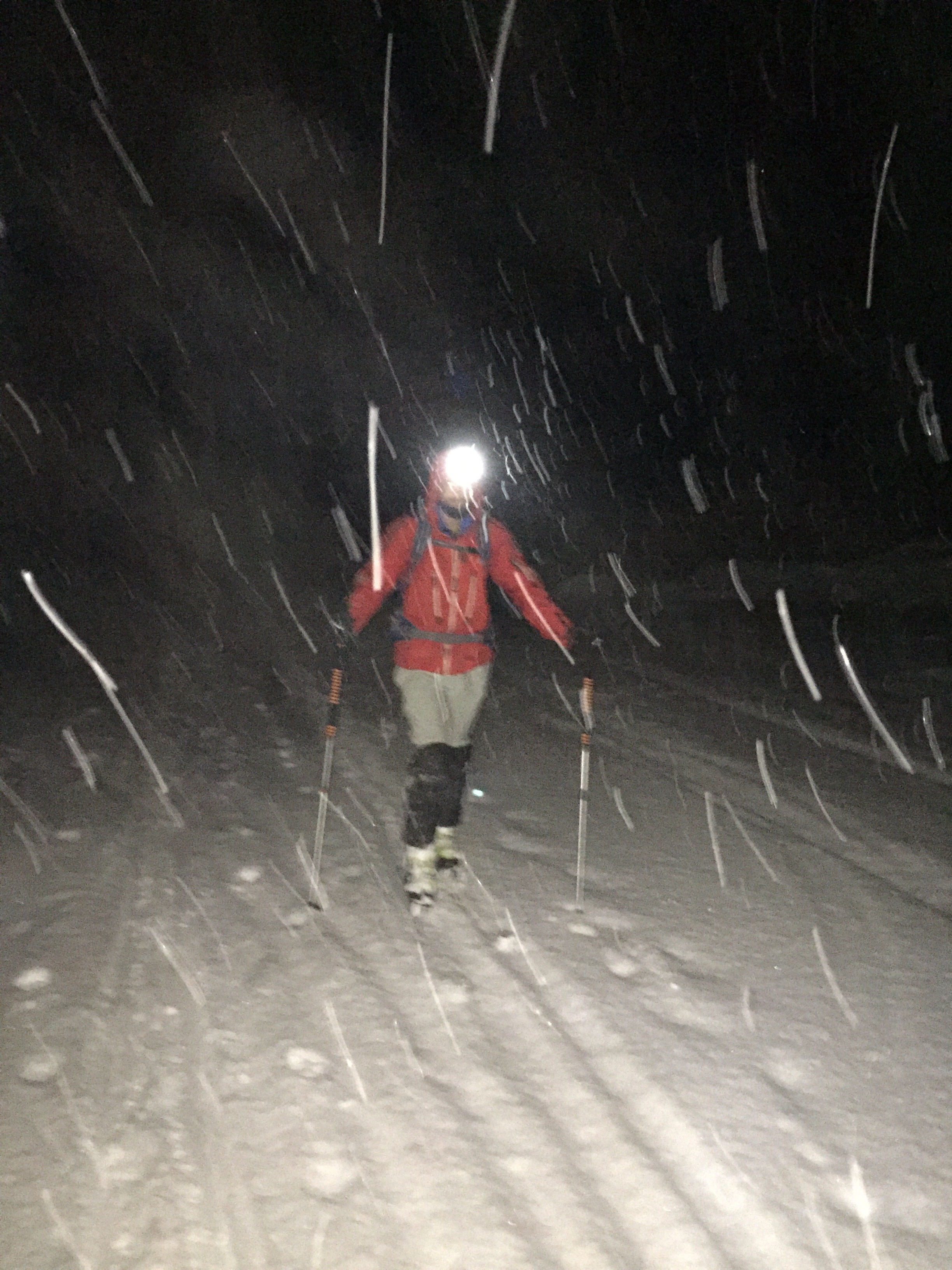 Es schneit mittlerweile recht gut, die Sicht ist nicht besonders, aber da wir den Weg kennen, ist das kein Problem. Da wir den „Ziehweg“ auf den Gipfel nehmen, machen wir fast keine Höhenmeter, dafür aber ein wenig Horizontalweg… nicht gerade spannend, aber es passt uns trotzdem gut.