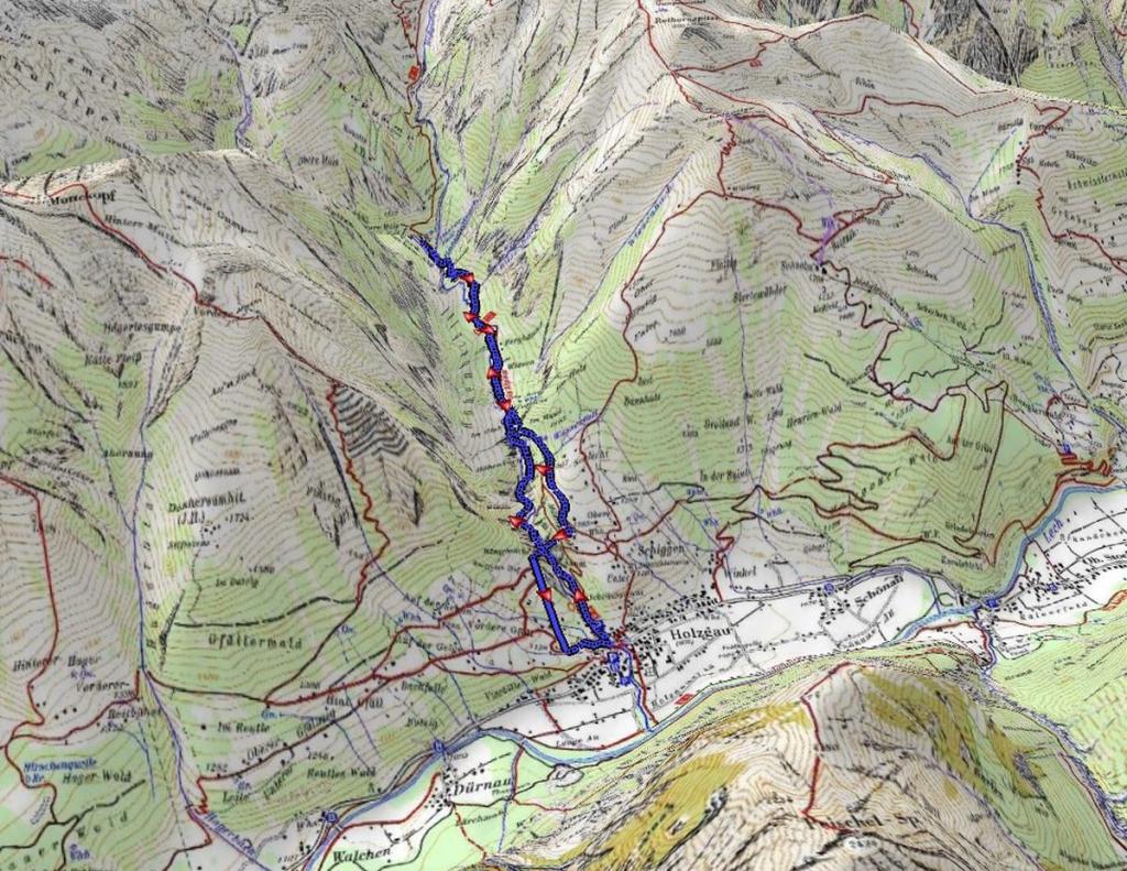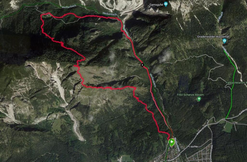 Wir nehmen den Steig über die Guflhütte, der uns direkt in die Mühlauer Klamm führt.