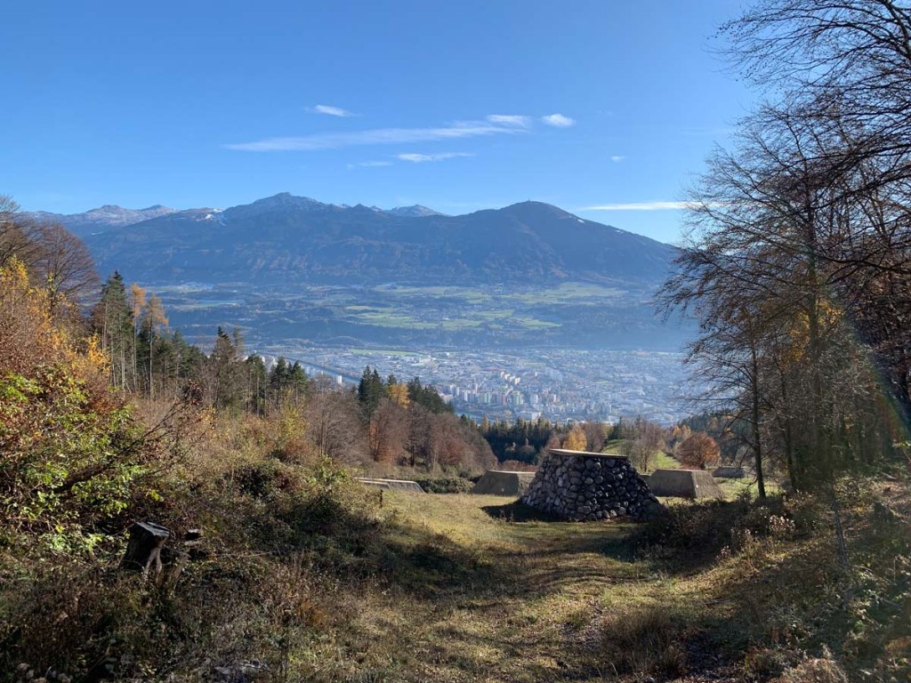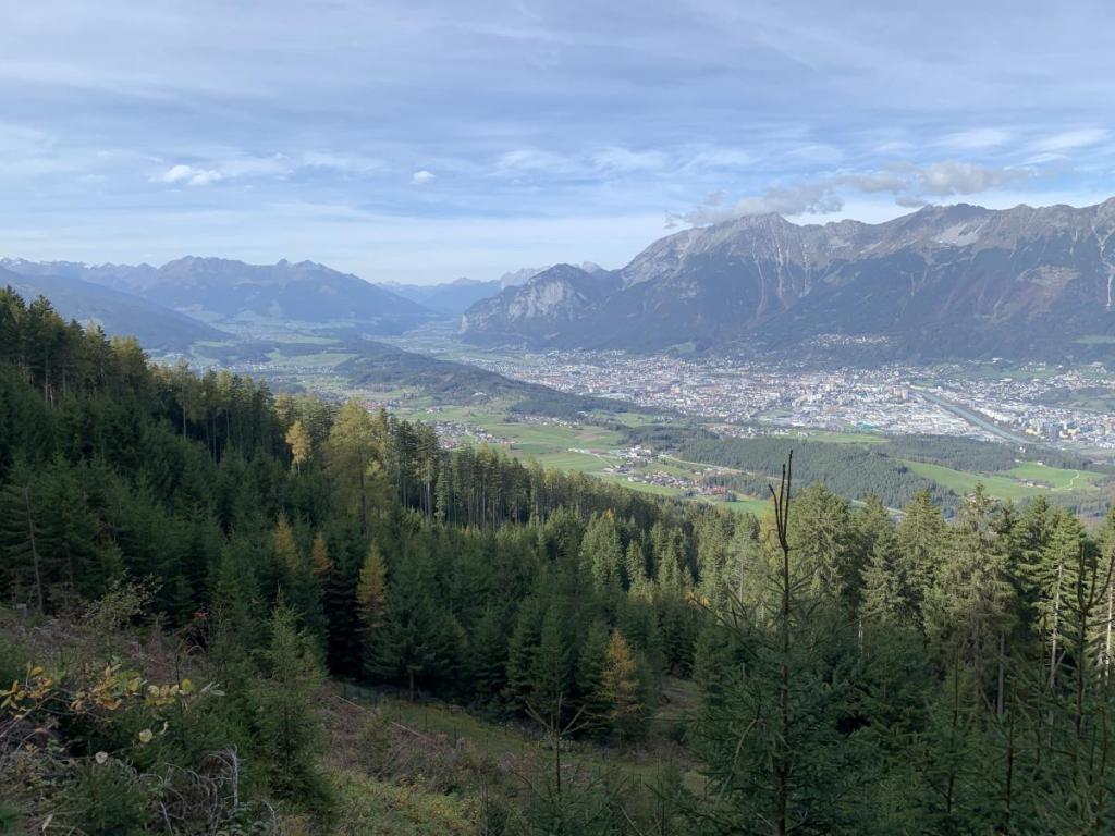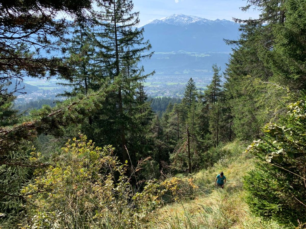 Bald schon haben wir eine schöne Aussicht auf die Landeshauptstadt, im Hintergrund der mächtige König Serles und links davon der Patscherkofel.