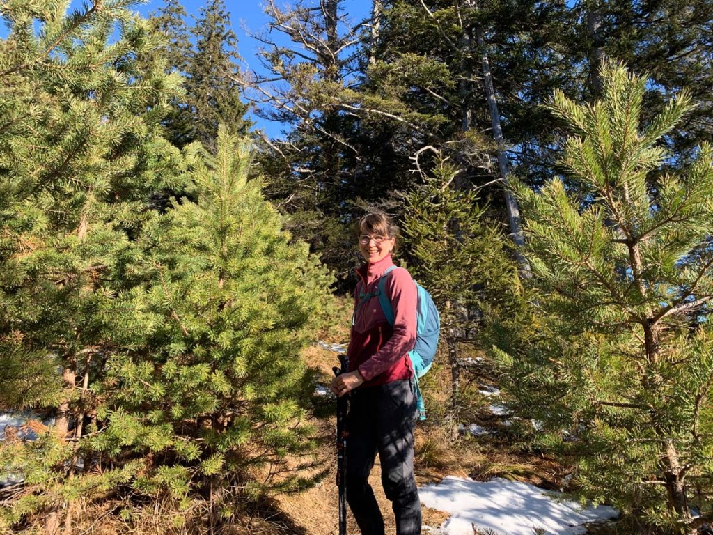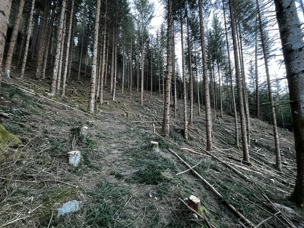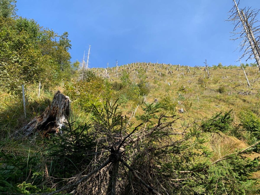 Erst durch Fichten und Föhren, wird der Wald mit der Höhe schnell lichter und der Ausblick besser. Je offener das Gelände wird, desto mehr sieht man vom Schaden und den Erhaltungsmaßnahmen.