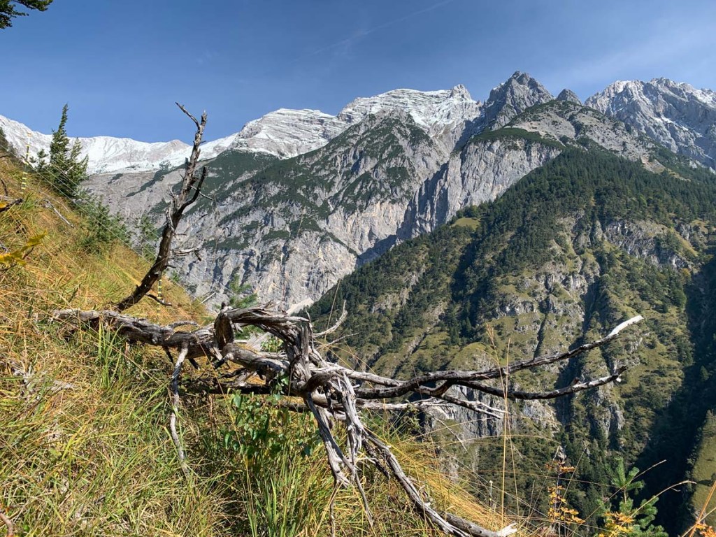 Die Luft ist klar, der Blick ins Halltal sensationell. Wir sehen bis zum Issboden, weiter oben soll dann der Ausblick noch besser werden.