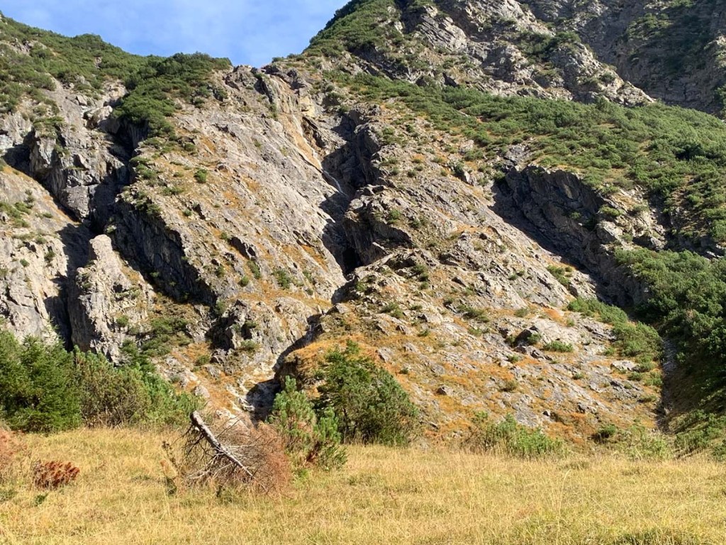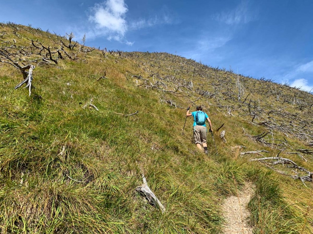Die Brandwunden sind verheilt, die Spuren allerdings überall sichtbar und spürbar. Im oberen Bereich liegt viel verdorrtes, bzw. verbranntes Krummholz: Latschen oder auch Legföhren genannt.