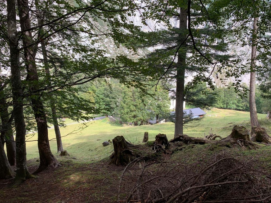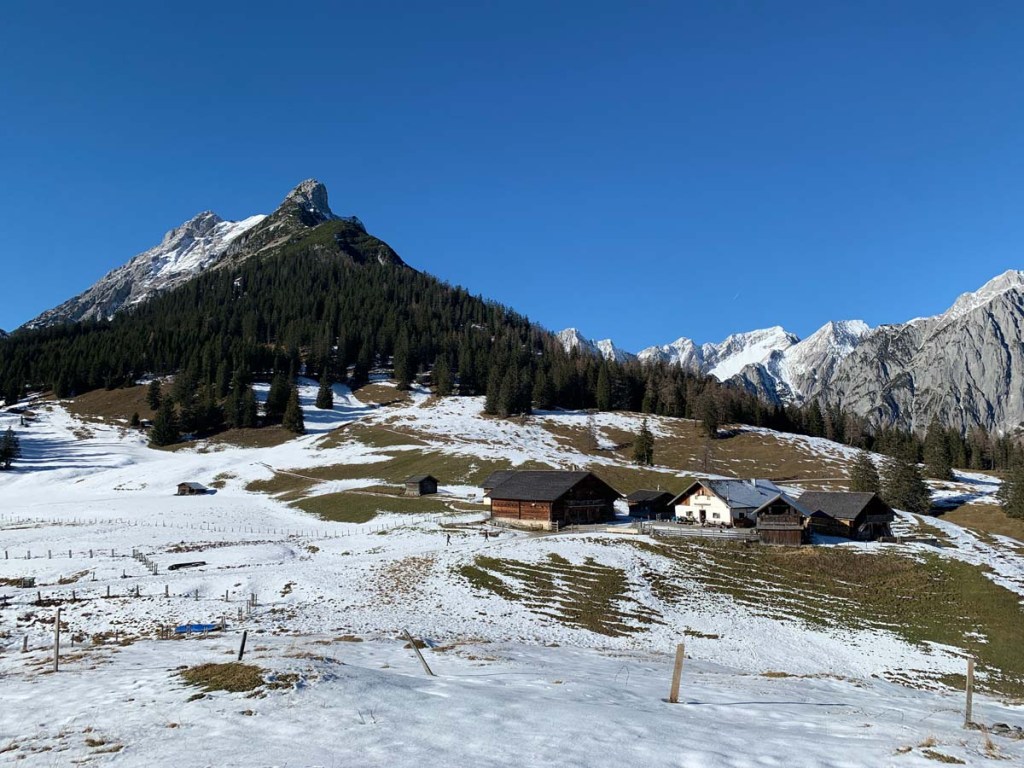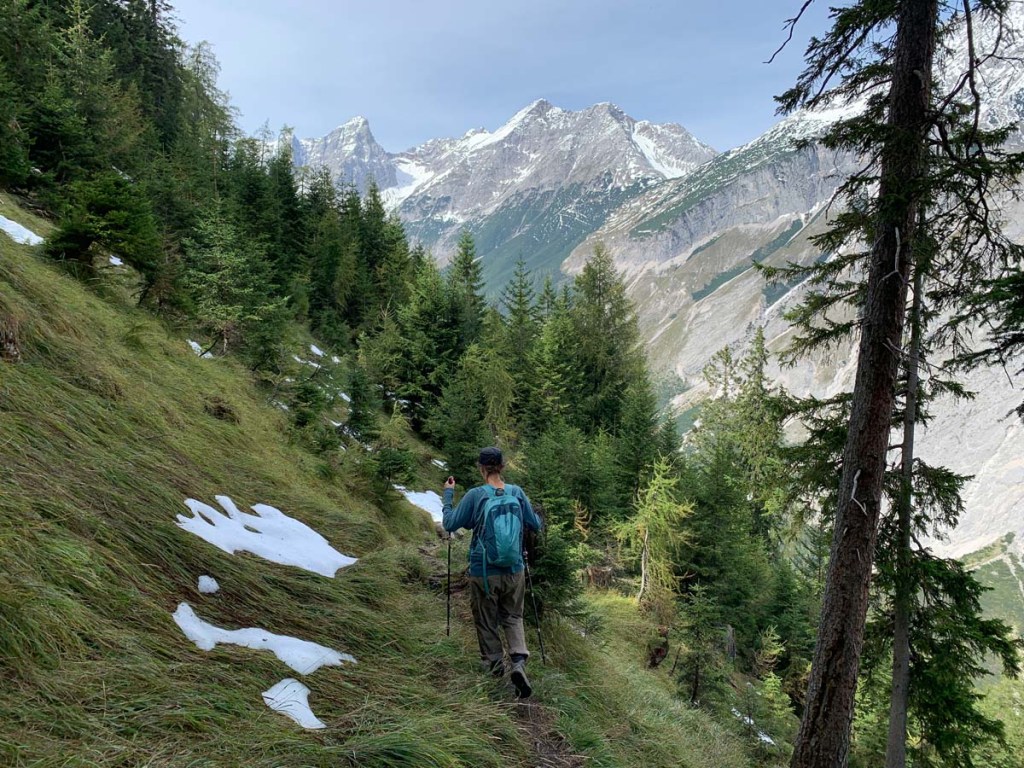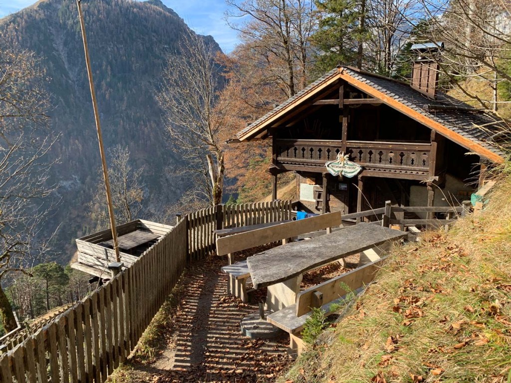 Von der Lichtung erreichen wir ohne Höhenverlust die Alpensöhnehütte. Wunderbar über dem Halltal gelegen, hat diese private Hütte einen grandiosen Ausblick von der Terasse!