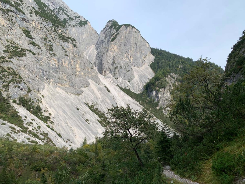 Im Hintergrund der Walder Alm sticht hauptsächlich die Huderbank-Spitze heraus, einen der nicht einfach zu besteigender Berg in der Hinterautal-Vomper-Ketter des Karwendels.