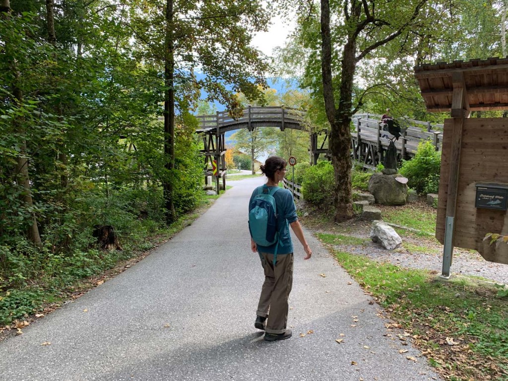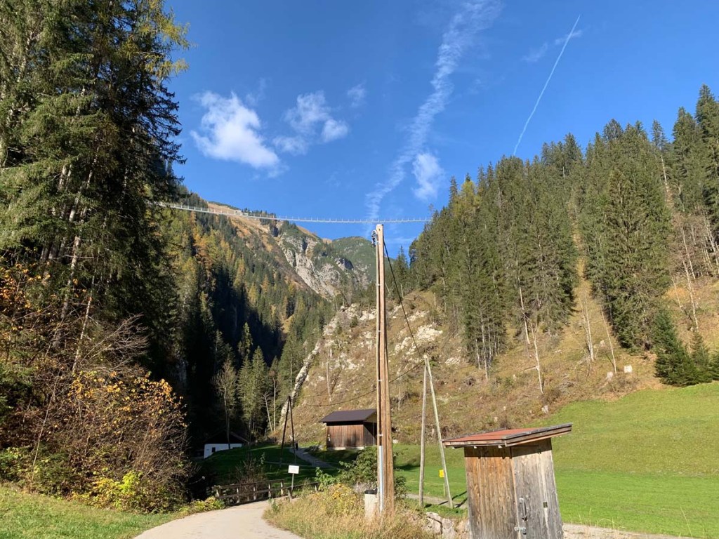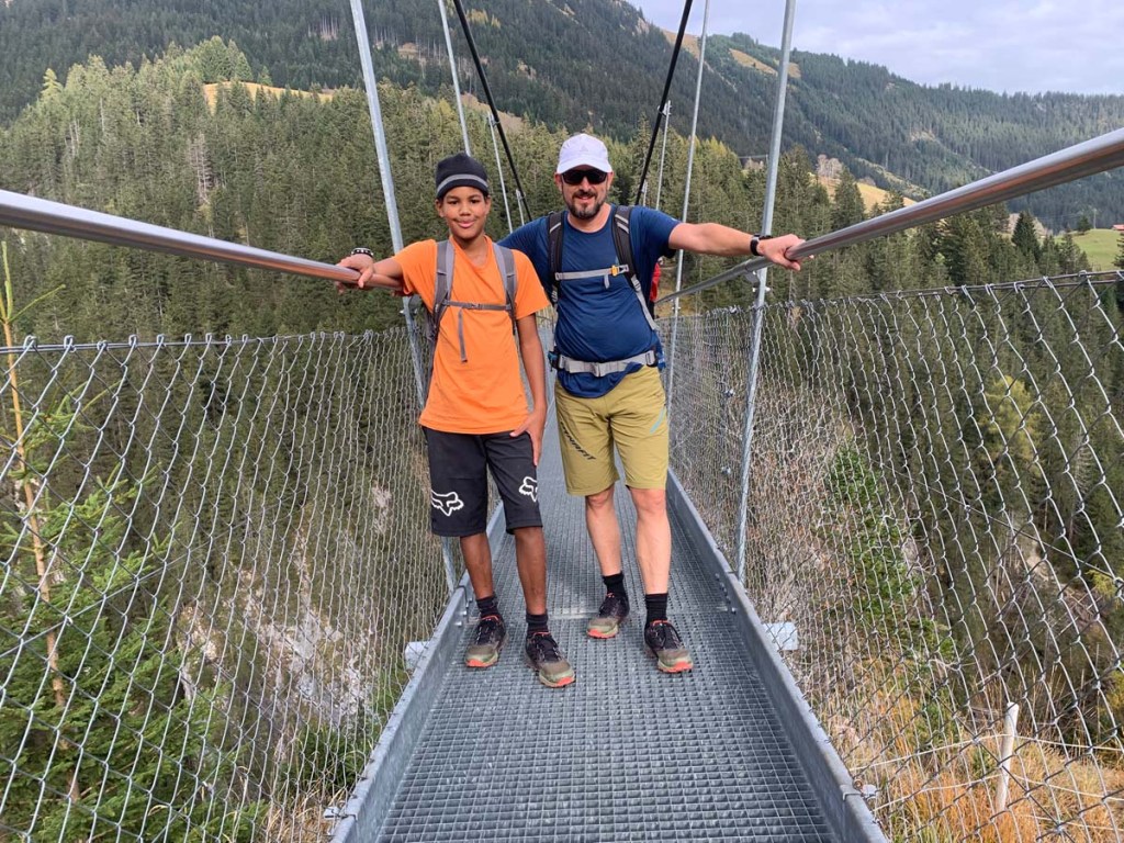 Heute stehen der Simms-Wasserfall auf dem Programm. Wir fahren nach Holzgau, hier stellen wir unsere Autos, wohlgemerkt kostenfrei, ab. Dann spazieren wir in das Höhental. Die Holzgauer Hängebrücke, die wir am Schluss noch überschreiten werden, spannt sich schon über uns.