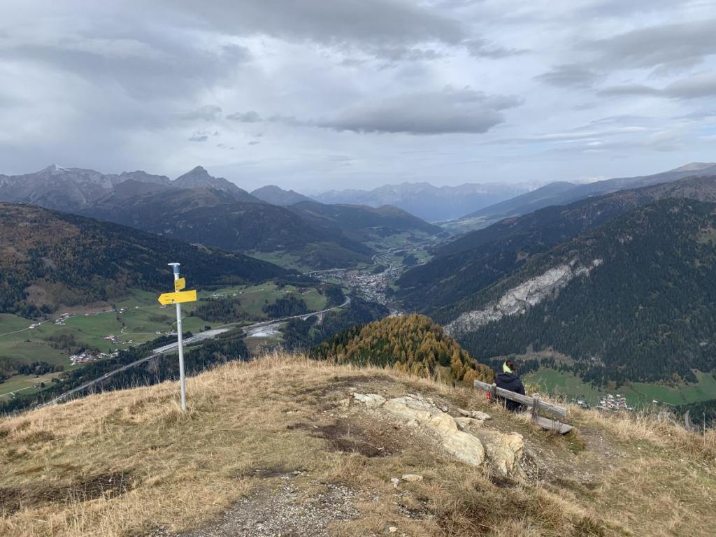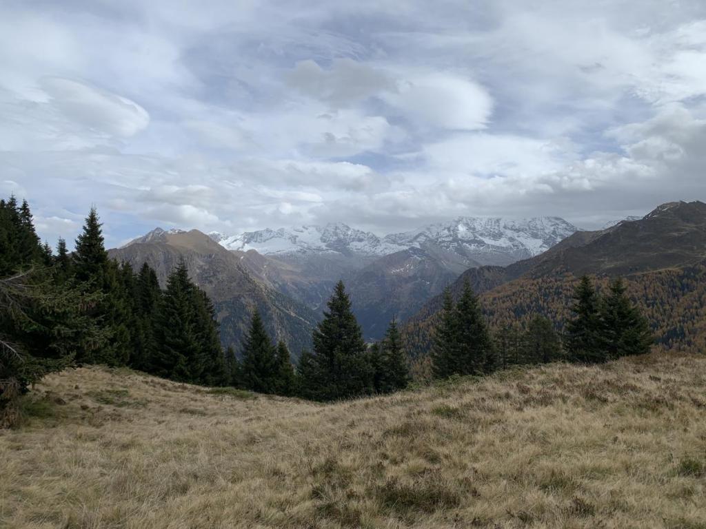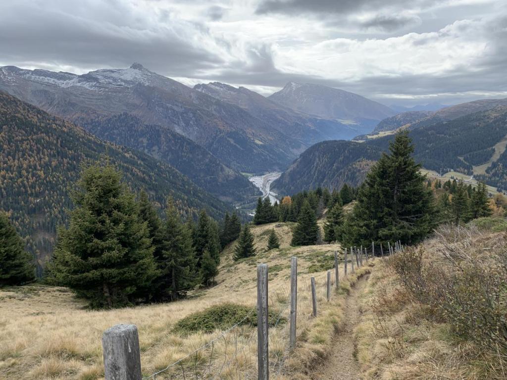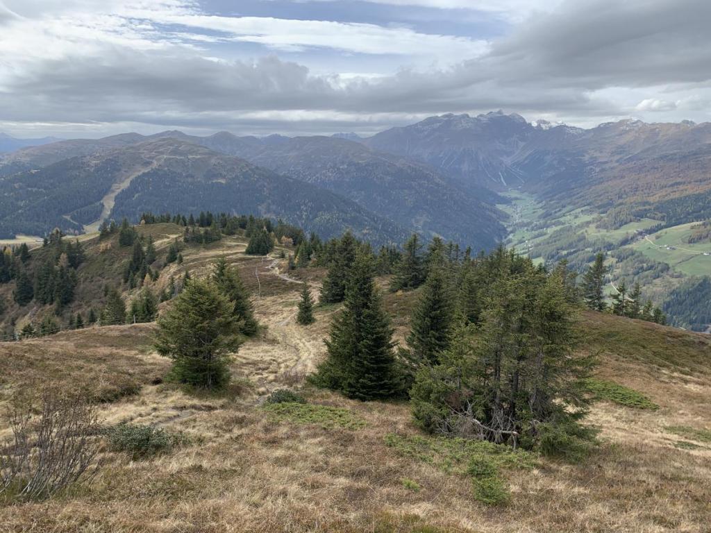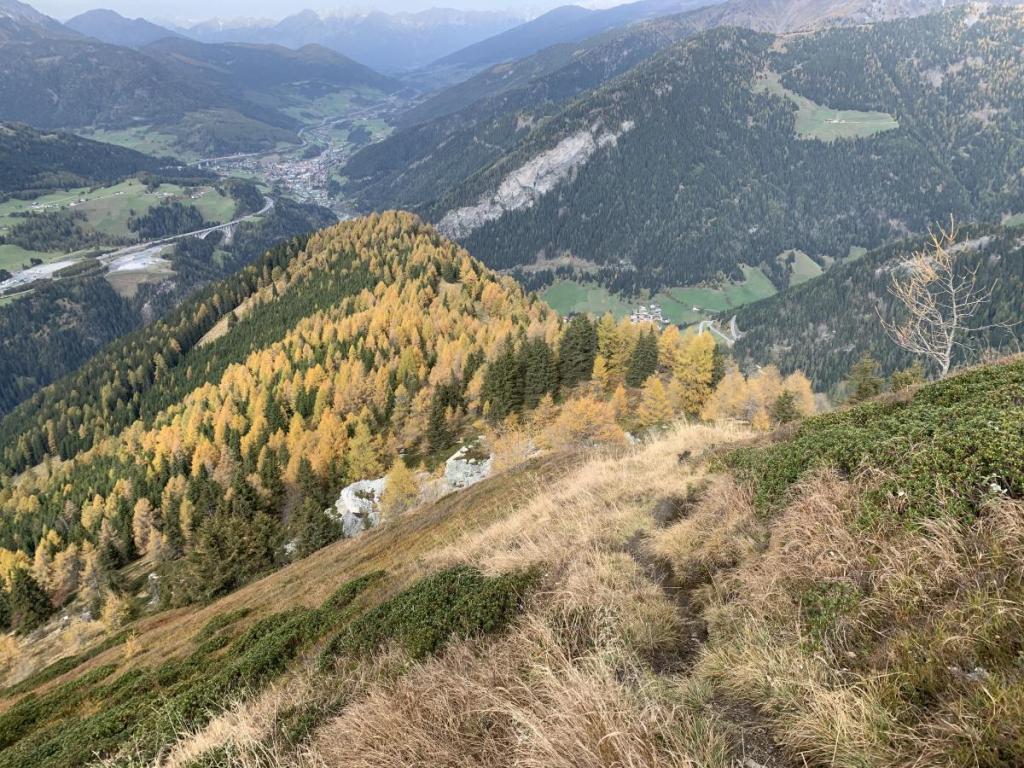 Wir steigen über den Nordhang ab, vor uns liegt das Wipptal, die Aussicht reicht bis zum Patscherkofel und dem Karwendel. Die Sonne scheint nun immer wieder und bringt die ausgedehnten Lärchenwälder zum glühen.