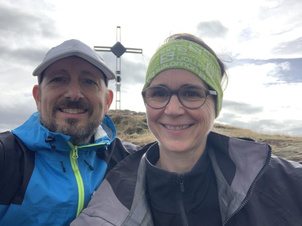 Die Stimmung ist eigen, wie es bei Föhnlage üblich ist. Einmal schaut es nach Regen aus, in nächsten Moment scheint wieder die Sonne. Direkt am Gipfel ist es ungemütlich, ein paar Meter unterhalb, auf einer Bank, sitzen wir aber dann im Windschatten.