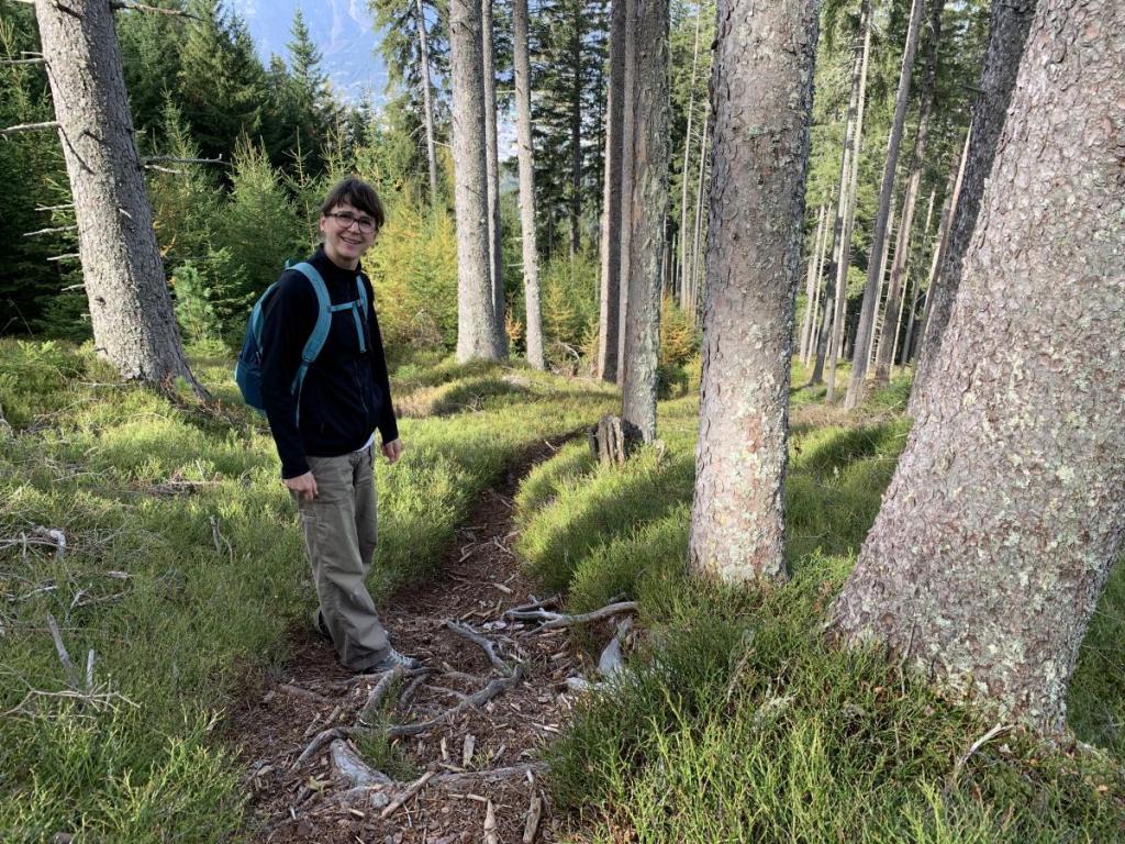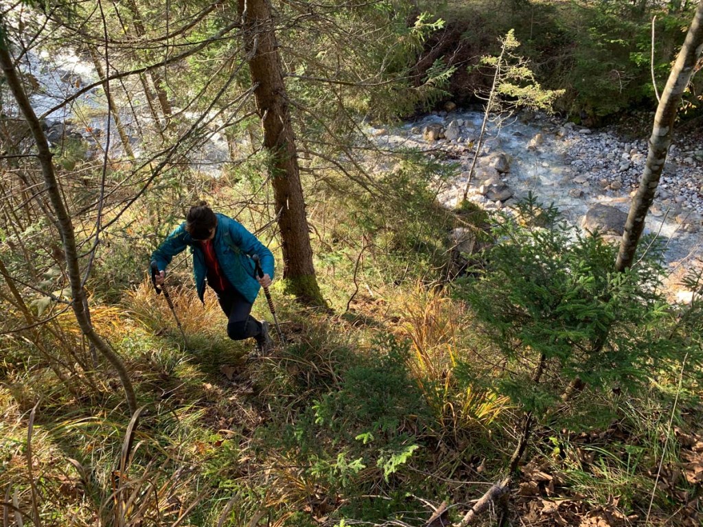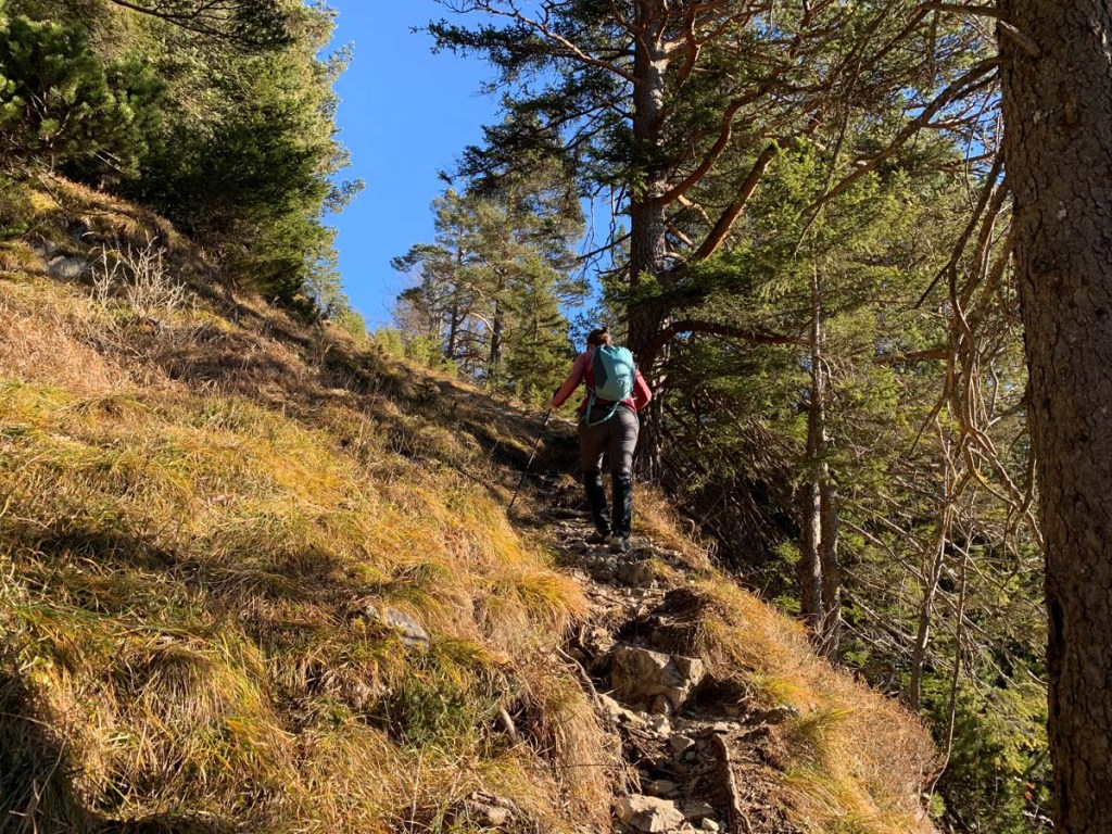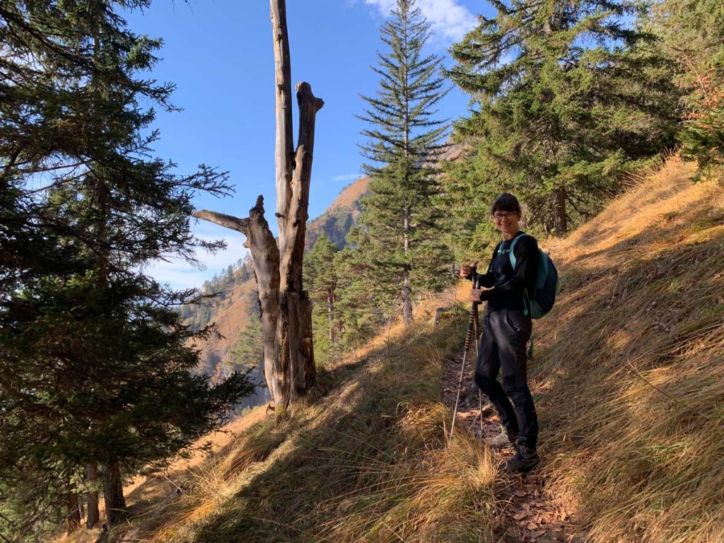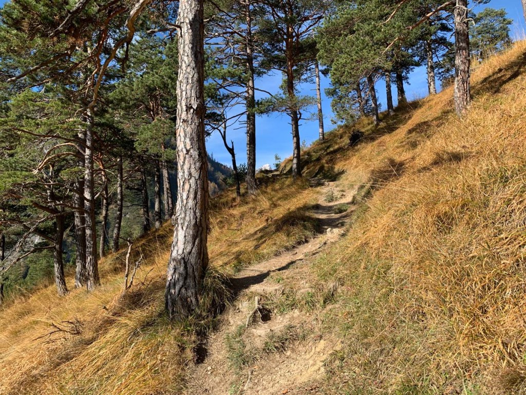Auf dem Weg nach unten sehen wir noch einen schönen Effekt der herbstlichen Entnadelung… überall liegen die Lärchennadeln und bedecken den Steig mit „Krippenheu“, wie ich die Nadeln auch nenne.