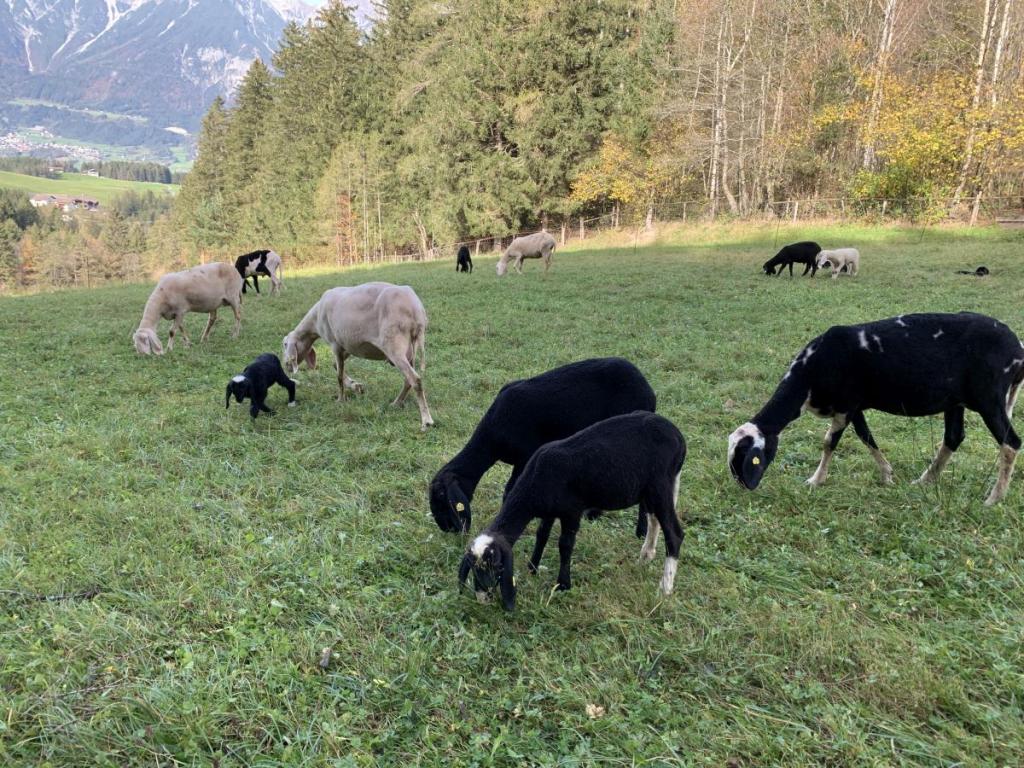 Über den alten Aldranser Almenweg erreichen wir die Felder oberhalb der Starkensiedlung. Hier grast eine Herde Schafe, die sich wahrscheinlich von der Alm retour gekommen sind.
