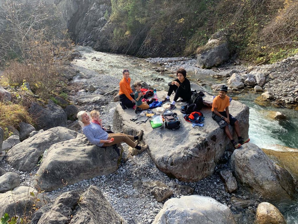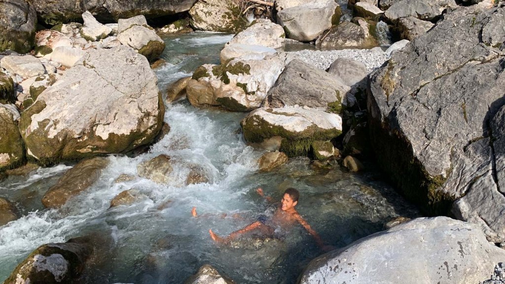 Oberhalb der Fälle finden wir einen schönen Platz zum Verweilen, die Kinder sind schon ein wenig hungrig, perfekt zum Jausnen. Letu hat „sicherheitshalber“ die Badehose mitgenommen und lässt es sich nicht entgehen, einen kurzen Dipp ins eiskalte Wasser zu machen.