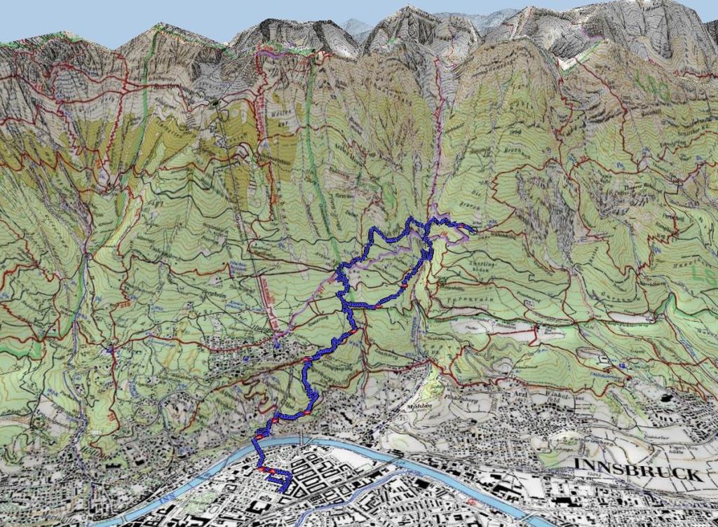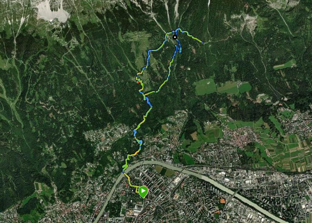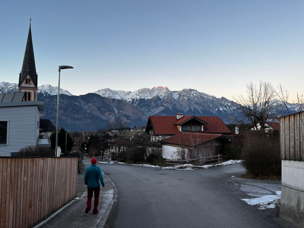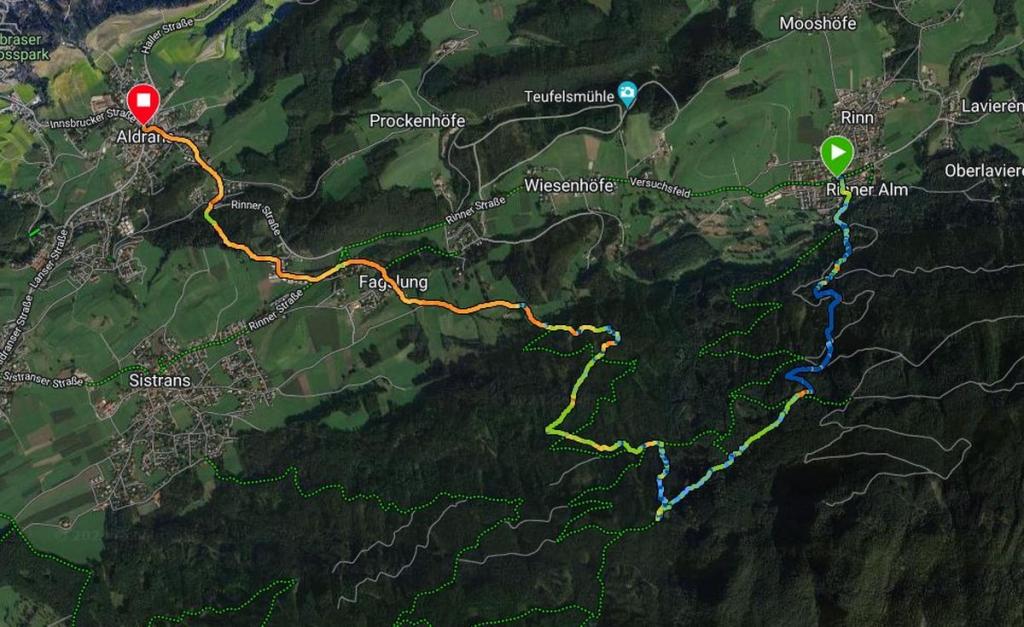Über die Starkensiedlung, die zu Sistrans gehört, erreichen wir das Gewerbegebiet. Rasch erreichen wir das Zentrum von Aldrans und sind wieder zu Hause.