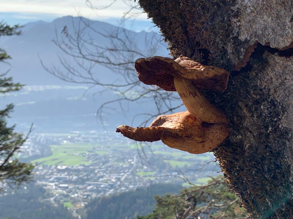 Wir passieren die Halltaler Hütte (1.220m), kleine Details am Wegesrand faszinieren mit immer wieder. Hier entdecken wir zwei Pilze, die aus einem abgestorbenen Baumstamm wachsen.